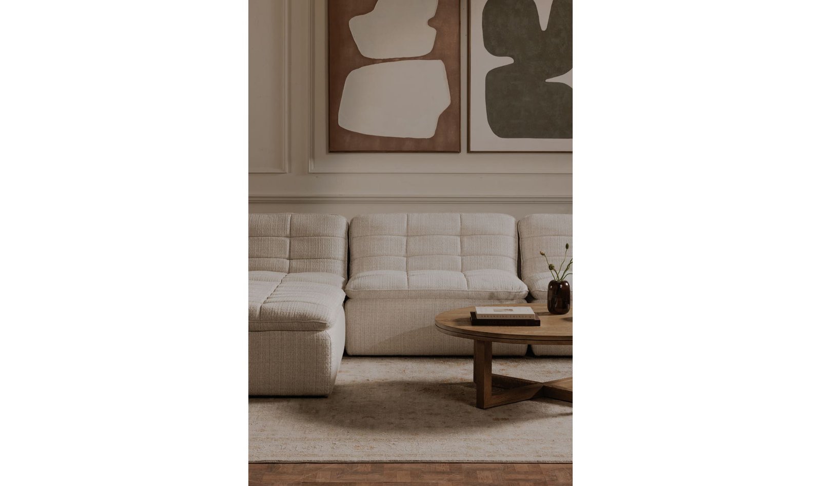 The Lino ottoman adds vintage charm reimagined for modern sophistication. Inspired by 1970s modernist design its distinctive grid-like channeling creates a captivating visual rhythm. Upholstered in a textured blend of viscose linen and cotton this ottoman offers indulgent comfort with its plush generously stuffed top. Dimensions: 42.5? W X 43.3? D X 17.7? H