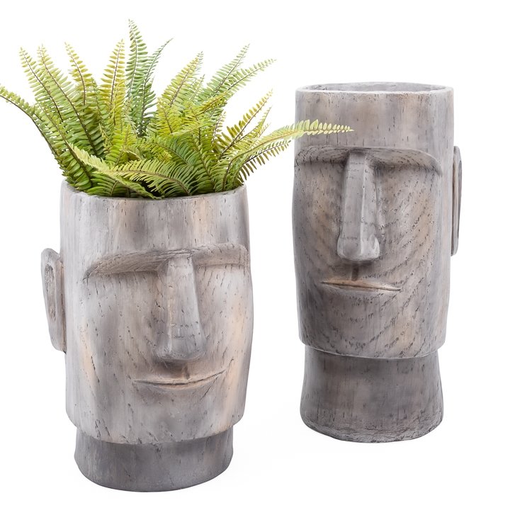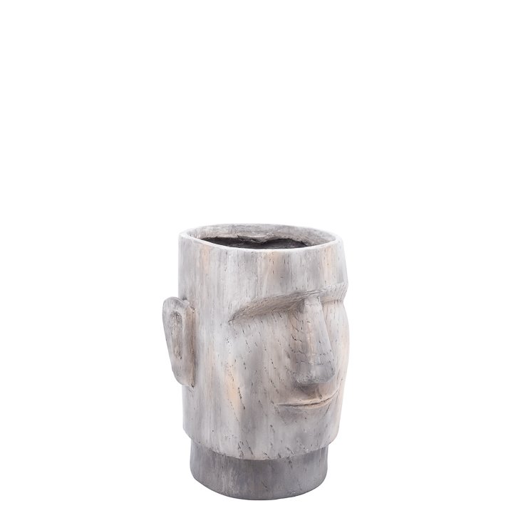 Add character to your home with this durable oversized MGO planters. The rustic wood grain patina highlights the shape of the modern face design. Perfect on the deck or patio it will transform the look of your space when filled with potted plants or a faux arrangement. Suitable for indoor or outdoor use in covered areas – just bring it in during freezing temperatures to protect from winter weather. Dimensions: 14 x 14 x 18.5h