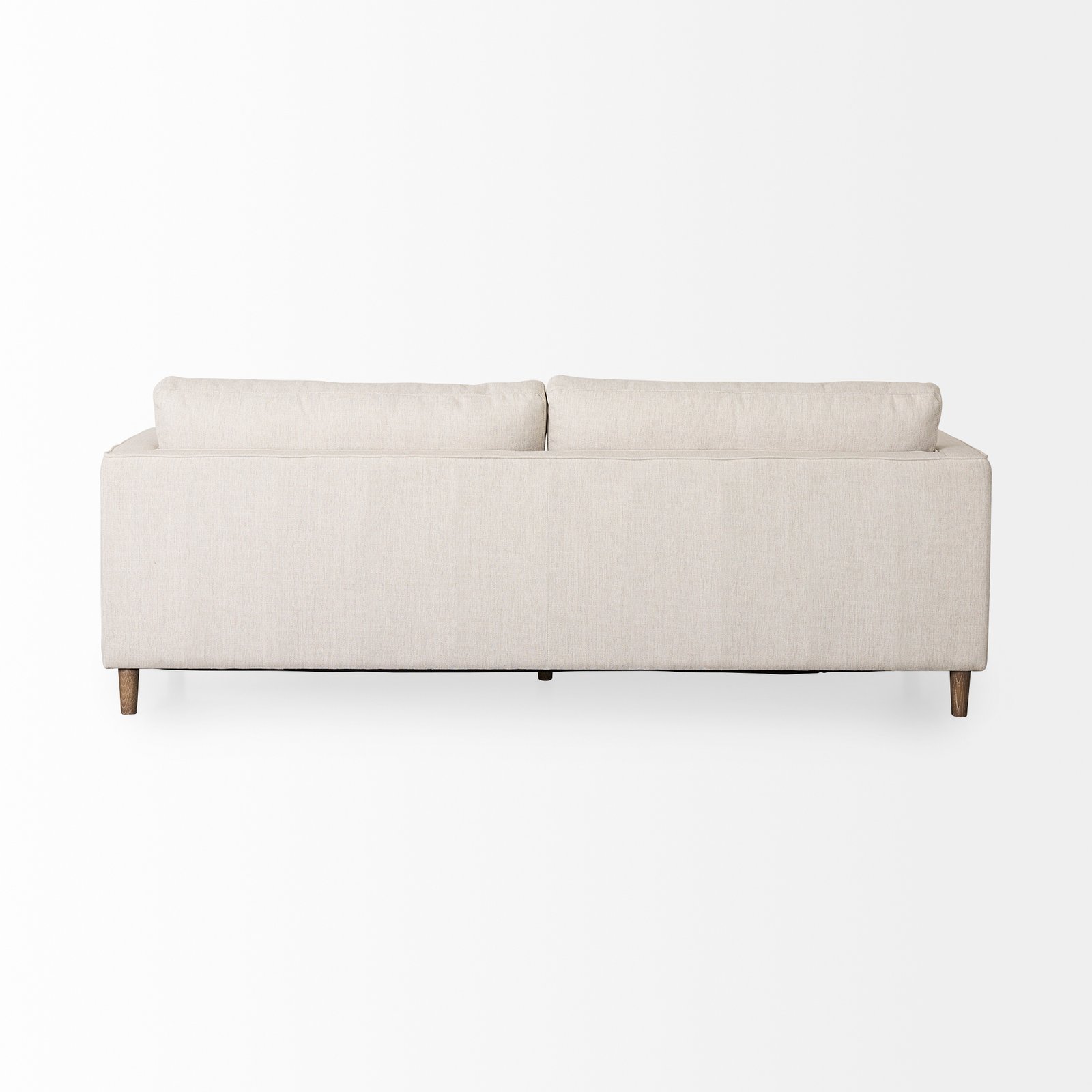 Loretta is a cream color fabric sofa with two matching bolster pillows.?The Loretta sofa measures 88.0″L x 36.2″W x 33.9″H.?Loretta is wrapped in cream color fabric and offers unparalleled comfort and is guaranteed to have you lounging for hours. The sofa is finished in a cream color with medium brown wooden legs and two matching cream bolster pillows.?The Loretta is braced by four solid wood legs that ensure exceptional stability and sturdiness.?The Loretta sofa can be paired with the Loretta fabric wrapped arm chair to complete the look making any living room look put together and luxurious.?The Loretta looks gorgeous in any modern space and setting and is guaranteed to add a touch of luxury to your space without compromising on comfort.. Dimensions: 88.0L x 36.2W x 33.9H