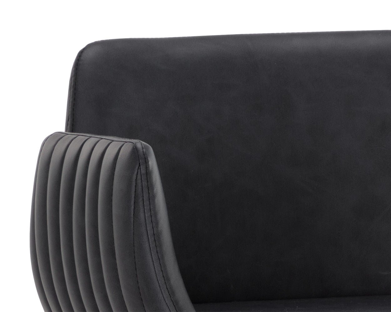 With its stunning scooped design the Lucano Barstool is an impressive addition to any dining space. Features vertical channel tufting on exterior seat. Stocked in smooth bravo black faux leather and completed with gold stainless steel legs. Stainless steel base features a durable powder-coated finish. Seat and back cushions are filled with foam for long-lasting comfort. Faux leather is produced to reflect the natural characteristics of leather. Colour variations markings wrinkles grooves and light scratches are appreciated characteristics of faux leather. No two pieces are alike. Dimensions: 24.25″W x 22.50″D x 40″H