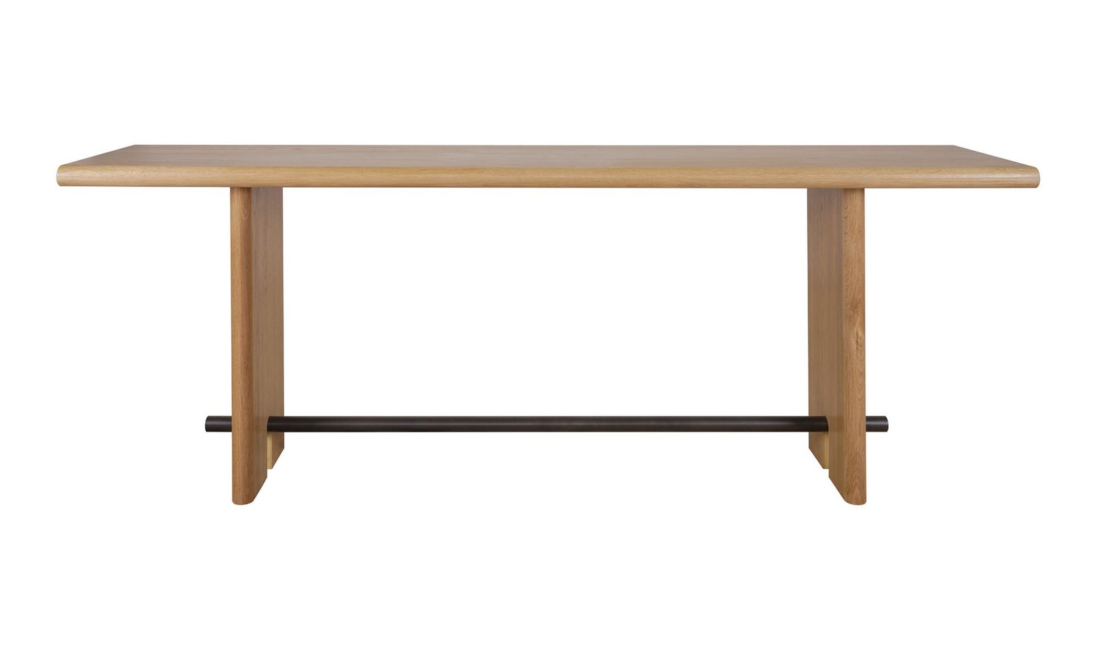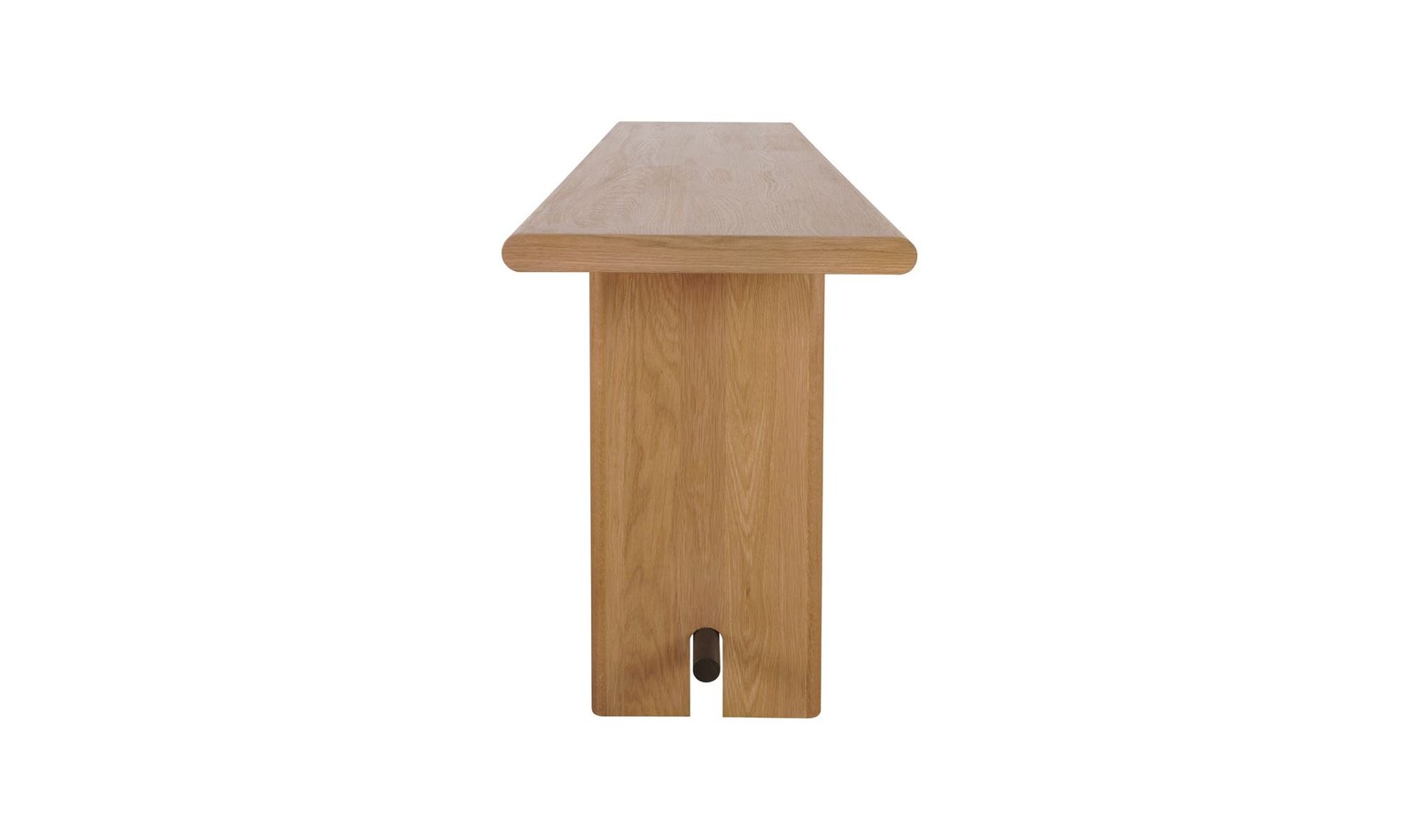 Crafted from solid oak and oak veneer the Madison console table’s graceful bullnose edges and crisp lines create a captivating interplay of form. Sculpted legs adorned with arched carvings are connected by a blackened bronze bar infusing a subtle industrial chic and offering a sophisticated focal point for entryways or living spaces.. Dimensions: 86.0? W X 20.0? D X 33.07? H