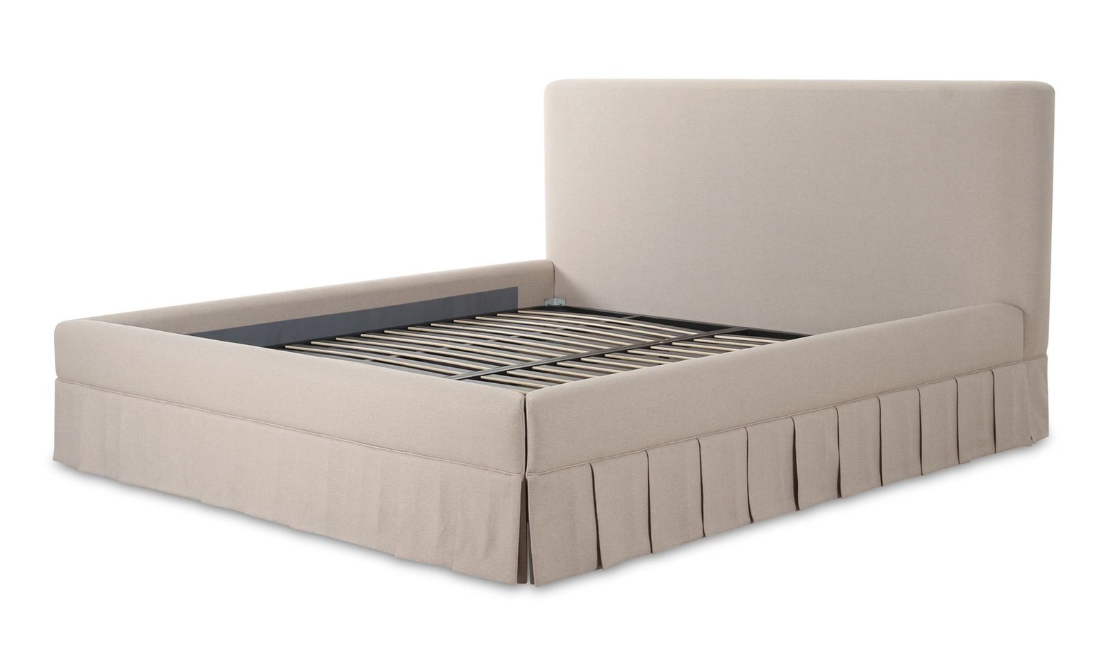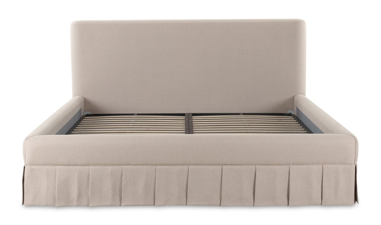 The Maren king bed exudes a soft feminine aesthetic upholstered in a warm neutral fabric and featuring a playful yet refined box pleat base reminiscent of vintage finesse straddling the line between contemporary form and traditional finish. With smoothly rounded corners and graceful curving forms adding softness to the design this piece is a study in elegance and subtlety.. Dimensions: 85.0? W X 92.0? D X 45.3? H
