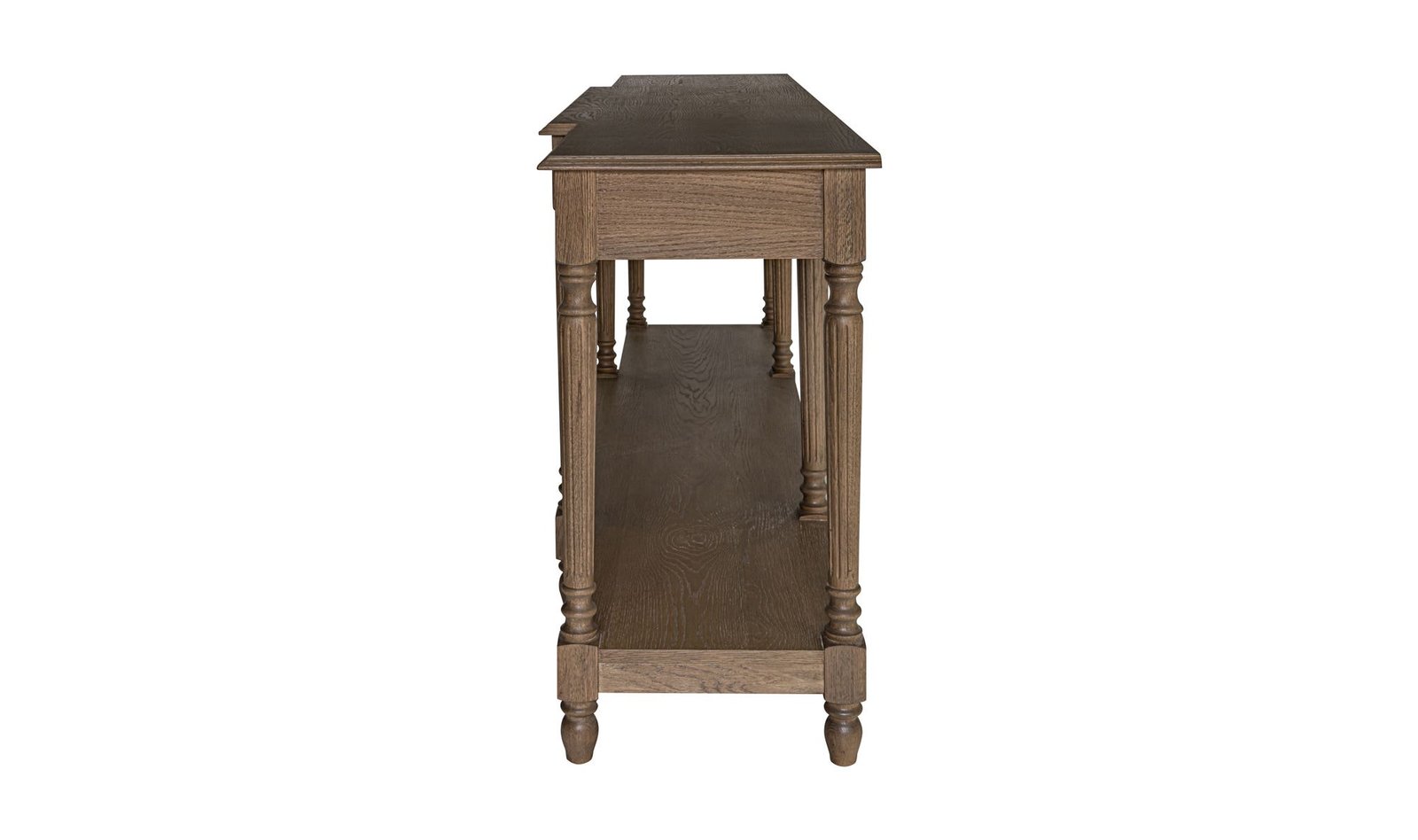 Meticulously crafted from solid oak with a rich brown finish the Martha console table’s graceful silhouette features an alluring overhang and expertly turned legs. A subtly protruding middle drawer adds dimensional intrigue while three drawers and an open shelf offer discreet storage.. Dimensions: 80.0? W X 19.625? D X 31.5? H