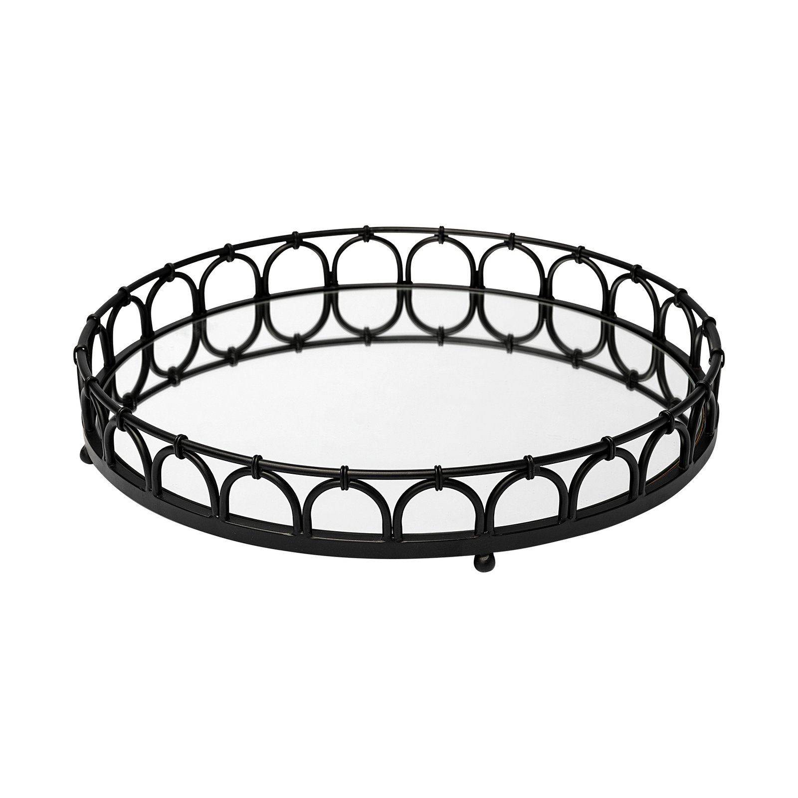 Crafted from metal and finished in a matte-black tone the Maud is a stunning round tray that flaunts a mirror glass bottom and intricately styled railings. With an elegant design that is complemented by the uni-tone finish the Maud fits perfectly in spaces based on the Mercana Modern design style.. Dimensions: 20.1L x 20.1W x 3.0H