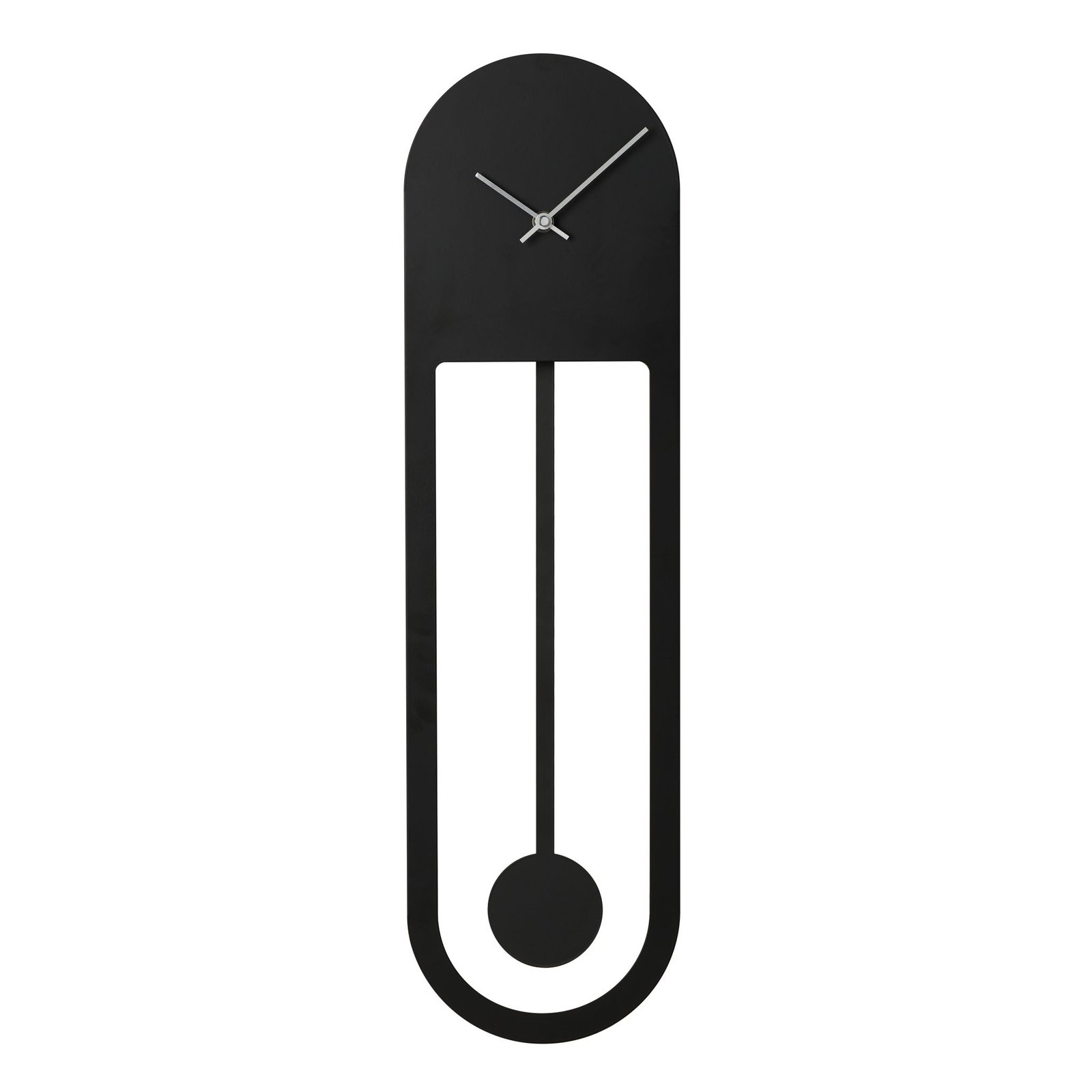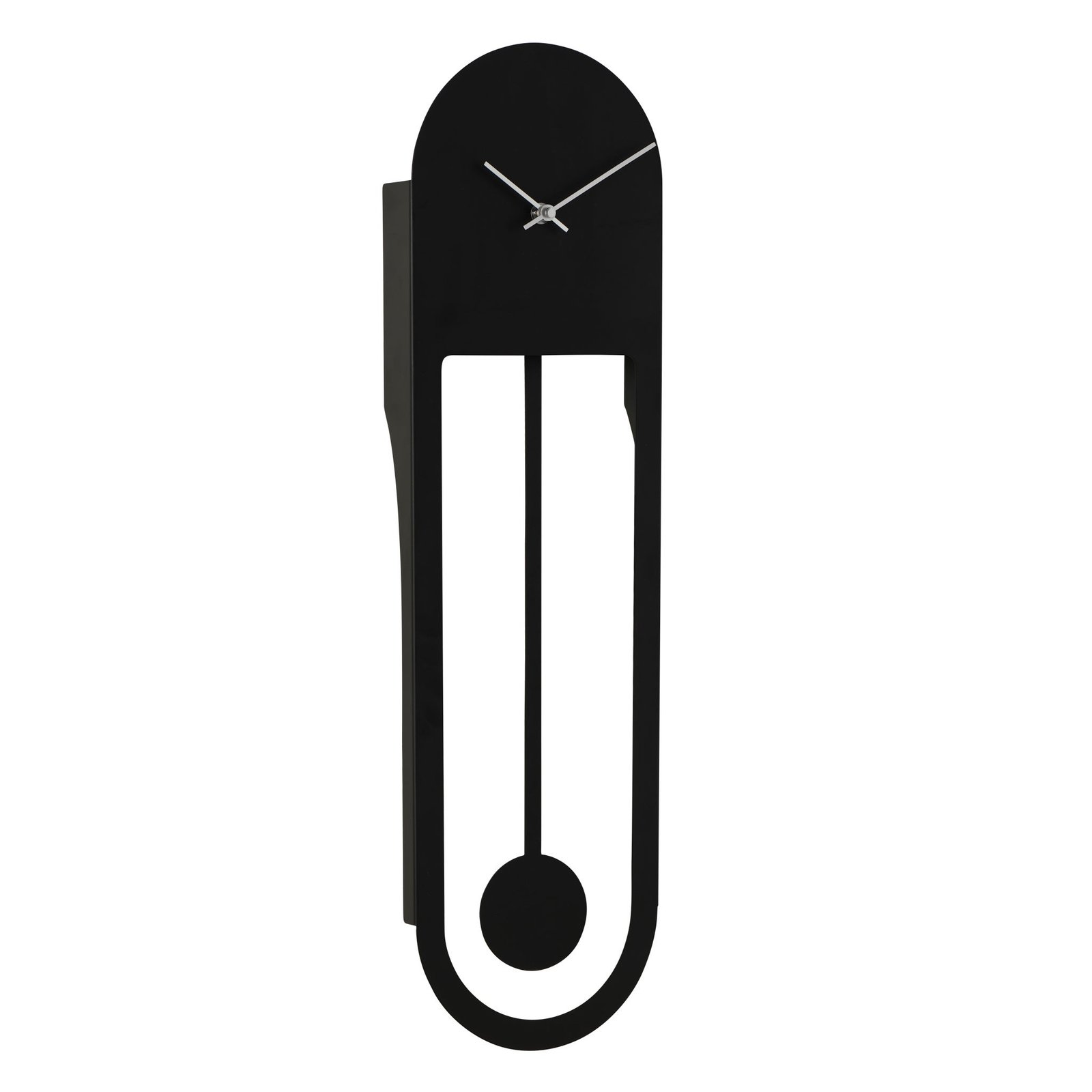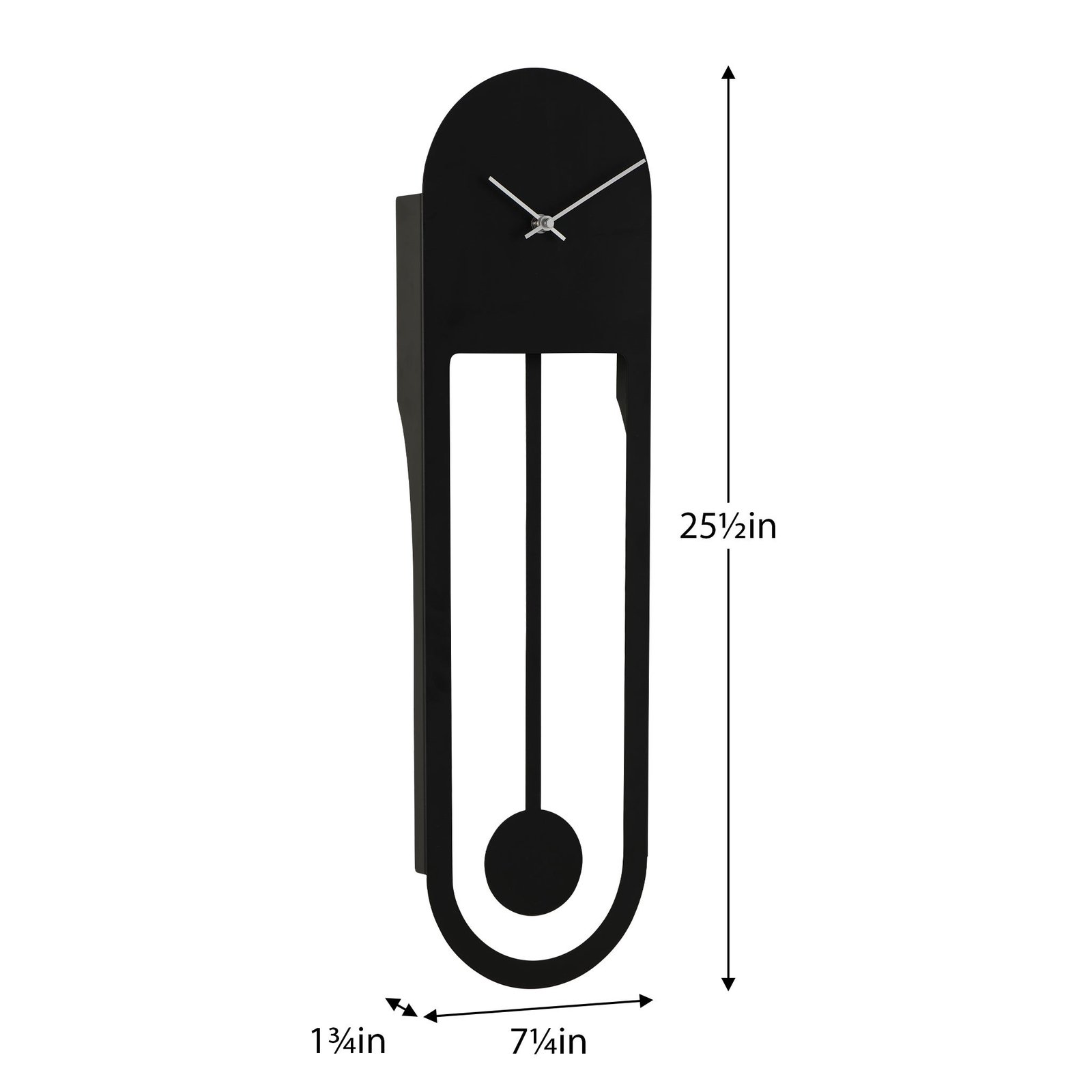 Perfect for the home or office this contemporary black metal wall clock features a modern oval shape and swinging pendulum. Dimensions: 7.25 x 1.75 x 25.5h