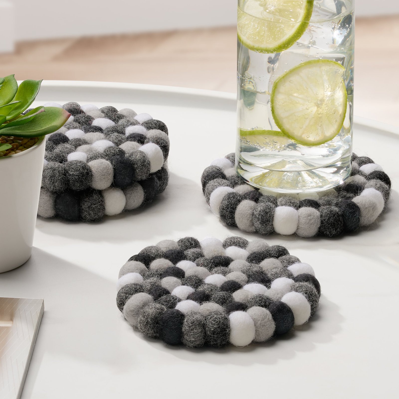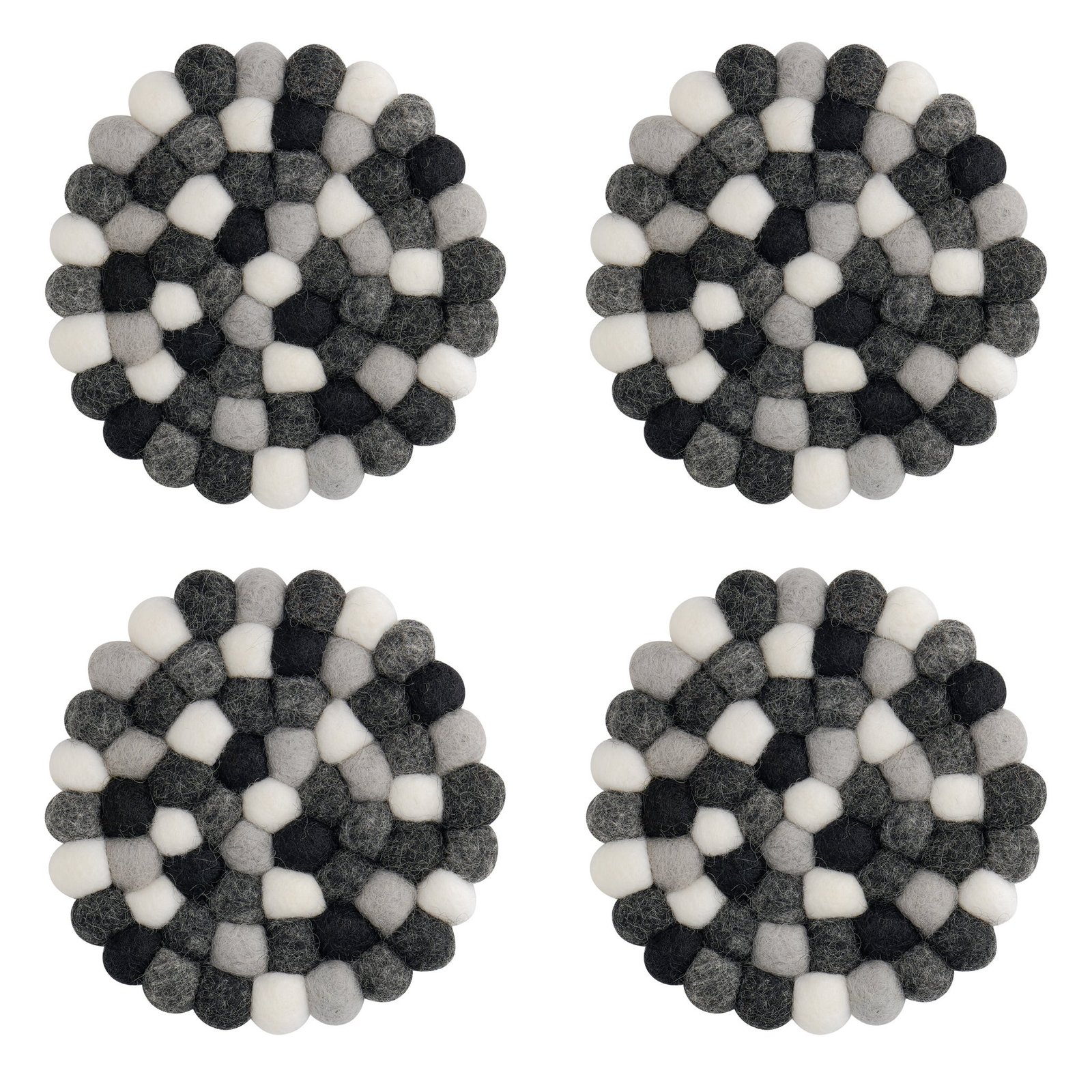 MODWOOL Felt Ball Four Piece Round 4 Inch Diameter Coaster Set – Black/White/Grey