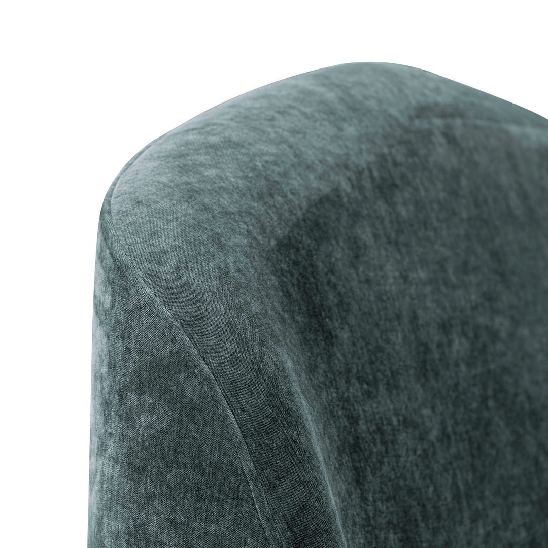Mid-century modern style with brass details on legs . Dust blue velvet fabric made of 100% recycled polyester . Dimensions: 67 x 94 x 49 ; 112lbs