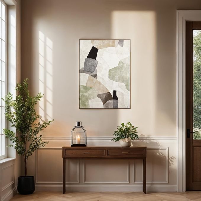 In a study of shape and colour this eye-catching wall art is ready to serve as a focal point in your next design project. Neutral hues come to life in soft textures hand-applied with a dry brush technique for an artisanal one-of-a-kind effect. Finished with a new bleached wood frame this abstract painting will bring an instantly modern update to any space.