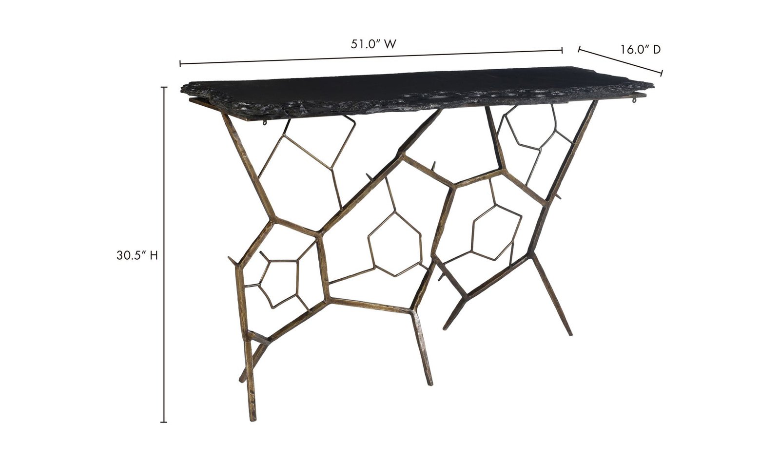 The Nate Slate Console Table is not for the faint of heart. This natural slate table features a dark rough edge that shows off layers of rock created slowly by the passing of time. An edgy iron construction with a complimenting brass finish makes this is a fierce piece of furniture.. Dimensions: 51.0? W X 16.0? D X 30.5? H