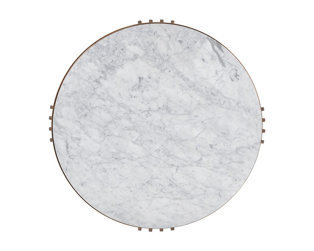 Introduce an element of grandeur to any space with this marvelous coffee table. Features a 21mm solid Carrara white marble top with a 6mm smoked tempered glass bottom. Completed with a stylish powder-coated metal frame in a rustic bronze finish. Coordinating console and end tables also available. As marble is a natural material unique veining pitting fissures micro-cracks and colour variations are all characteristics that add to the uniqueness and beauty of each piece. Dimensions: 38″D x 16.25″H