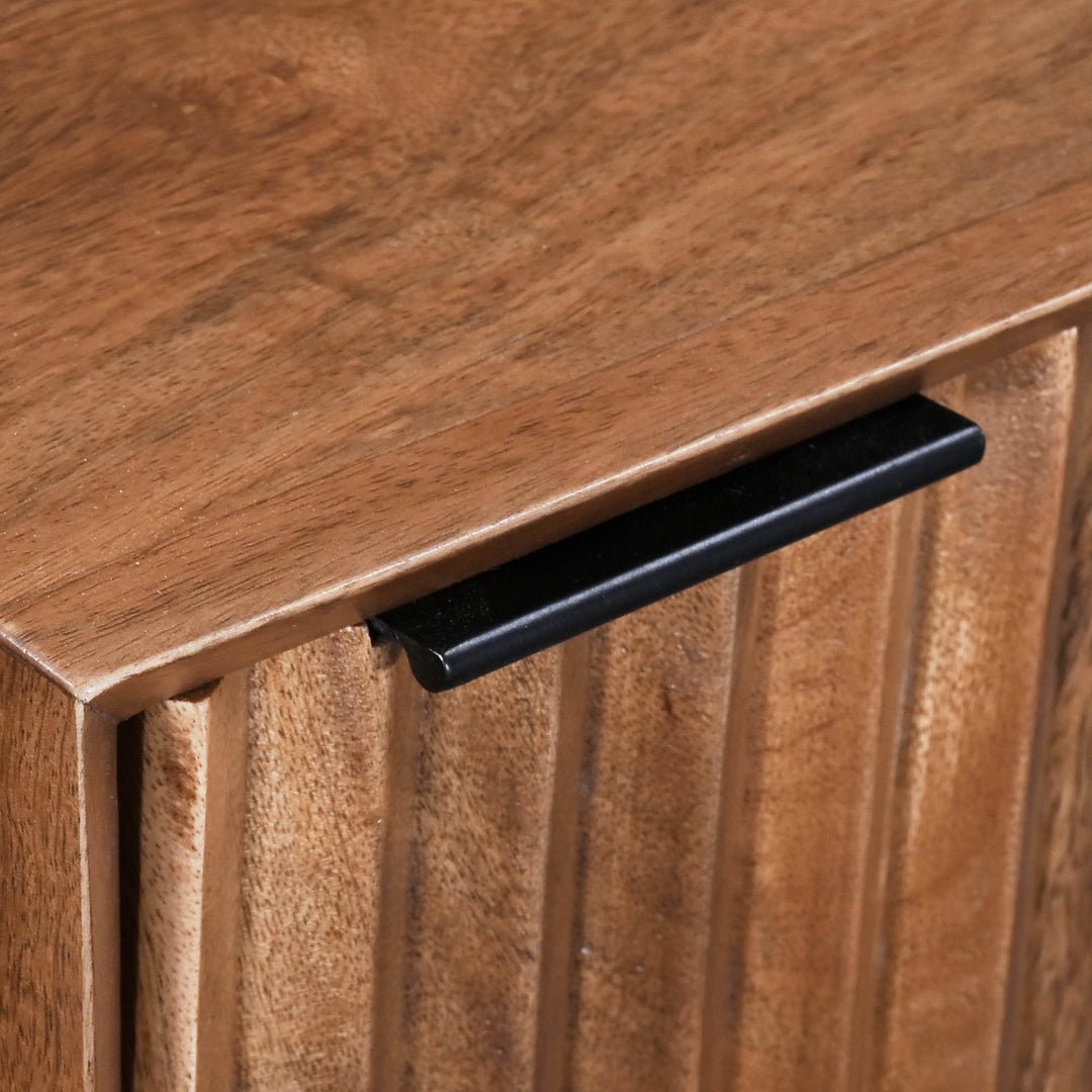 This nightstand stands out with its unique fluted pattern adorning the doors. This exceptional design seamlessly transitions from vertical to horizontal. creating a visual masterpiece that is as captivating as it is innovative. . Equipped with sleek black metal handles. this nightstand is not only a visual delight but also a practical storage solution. . The contrast between the natural tones of the mango wood and the boldness of the black metal elements adds a harmonious balance. resulting in a nightstand that is both elegant and contemporary. . Dimensions: 17 x 14 x 23 ; 23lbs