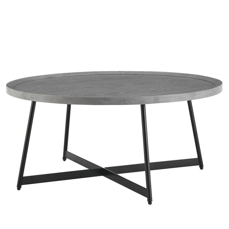 The Niklaus round coffee table is both perfectly symmetrical and distinguished. With a gray stained oak veneer top solid edges and a black steel base let this coffee table catch the eye of any wandering guest. Prominent and bold while also graceful.. Dimensions: 35.4″L x 35.4″W x 15.8″H