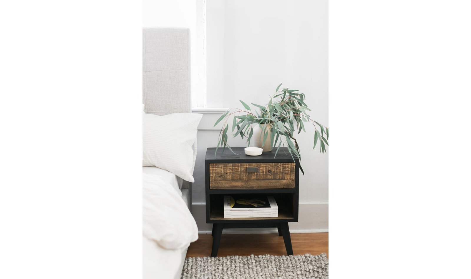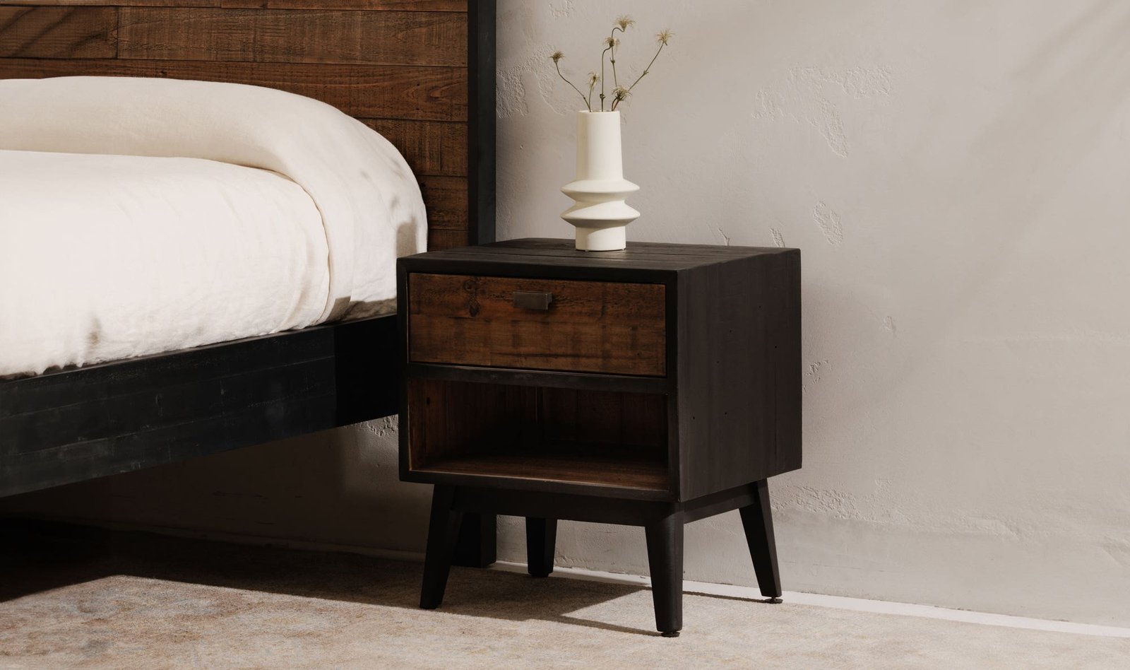 A new look in a rustic nightstand the Nova features an attractive two-tone black and natural finish. Made with solid reclaimed pine the nightstand features one drawer and one open space for a combination of open and hidden storage options. Sustainable and built to last.. Dimensions: