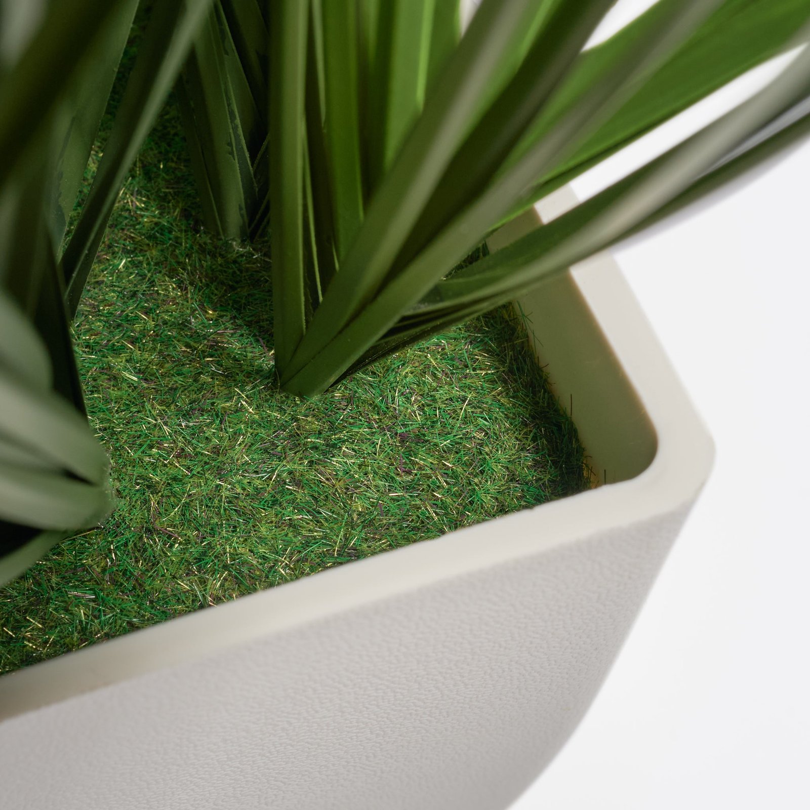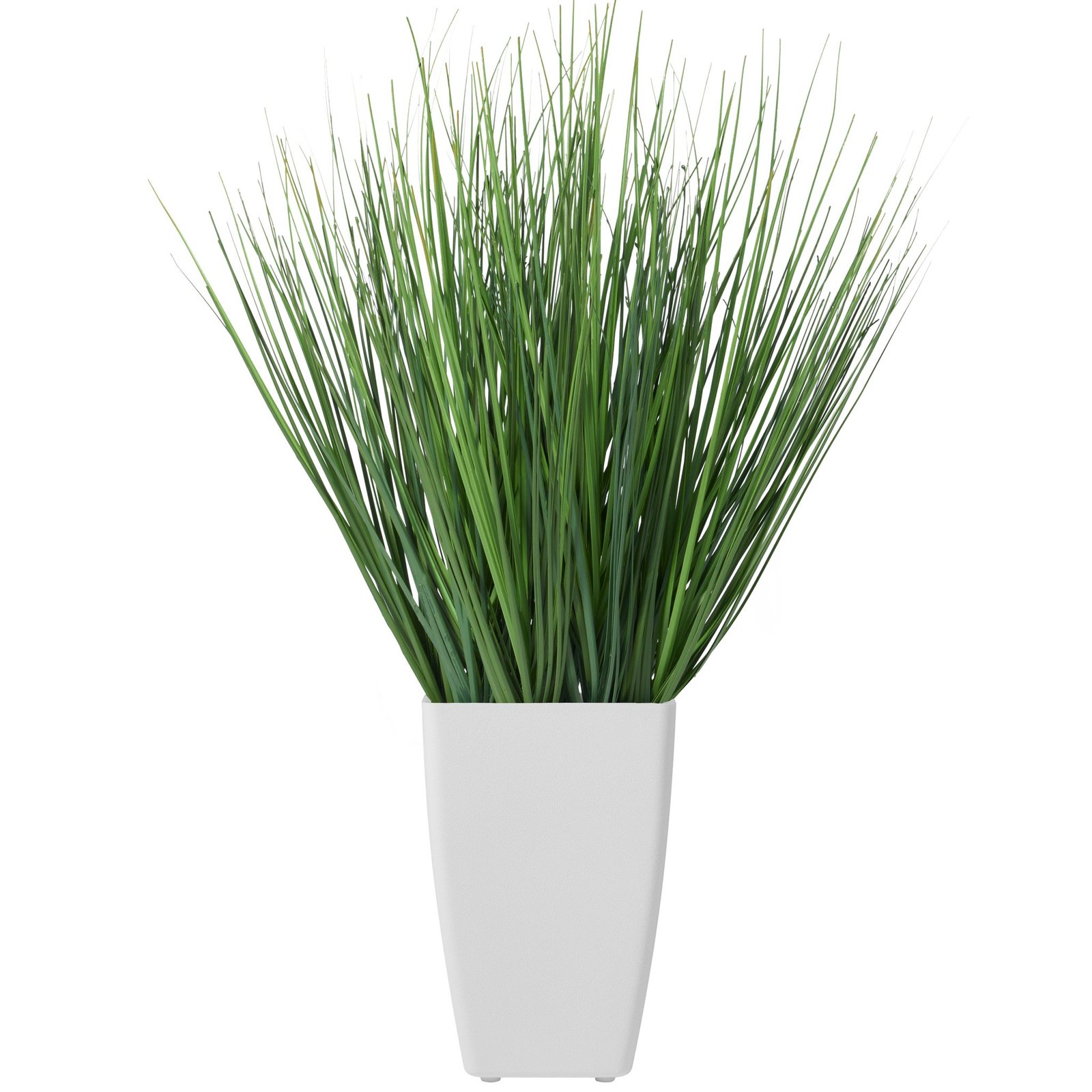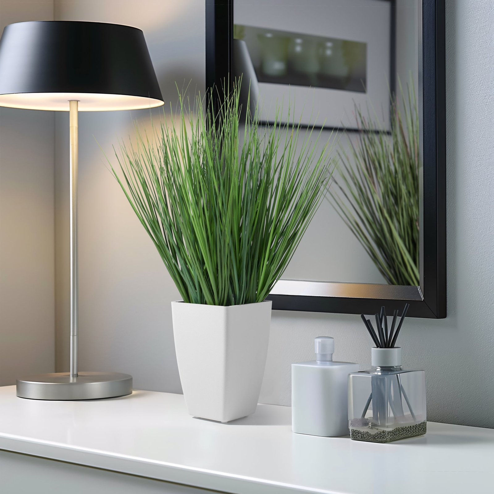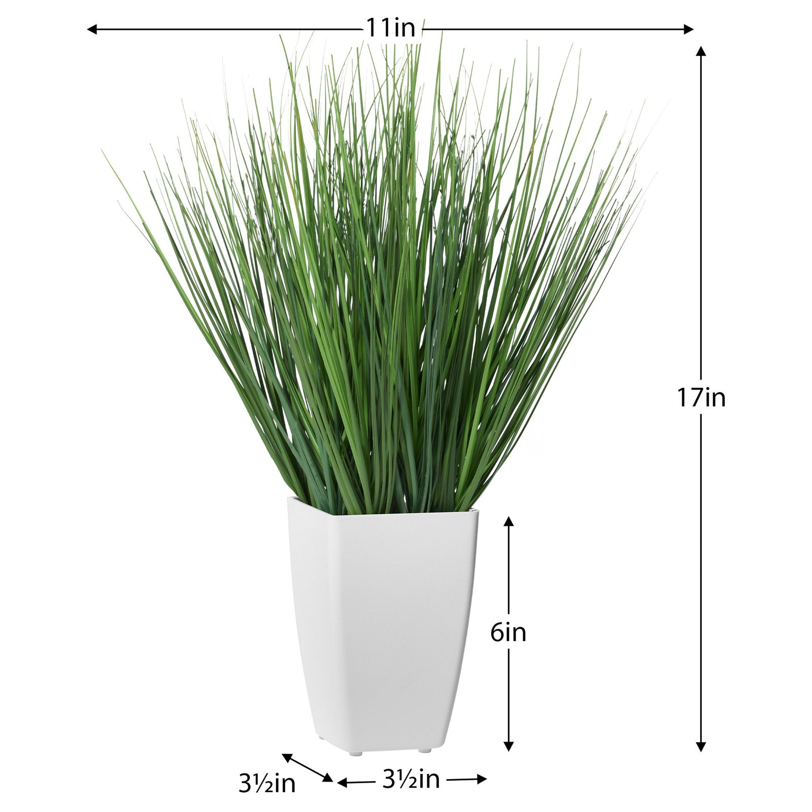 Standing 17 inches tall this Onion Grass Artificial Faux Potted Plant features a sleek white square pot. Its lifelike foliage and hassle-free maintenance make it a perfect addition to any room adding a refreshing touch of greenery. Elevate your home or office decor with this stylish and enduring botanical piece. Plastic pot included. Dimensions: 11 x 11 x 17h”. Pot. 3.5 x 3.5 x 6h