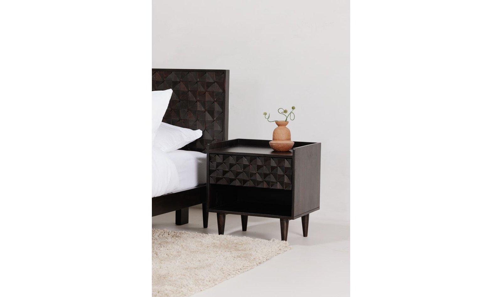 Crafted in solid Sheesham wood with a black finish the Pablo bed features an intricately designed headboard with each piece carefully arranged by hand. The texture and visual intrigue of the detailed headboard are underscored by the organic beauty of the natural wood adding inviting warmth to the bedroom.. Dimensions: 63.0? W X 83.0? D X 39.5? H