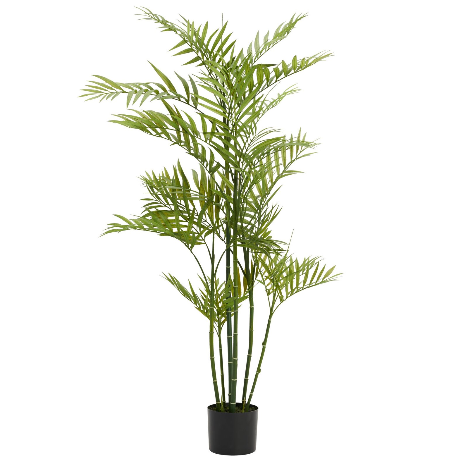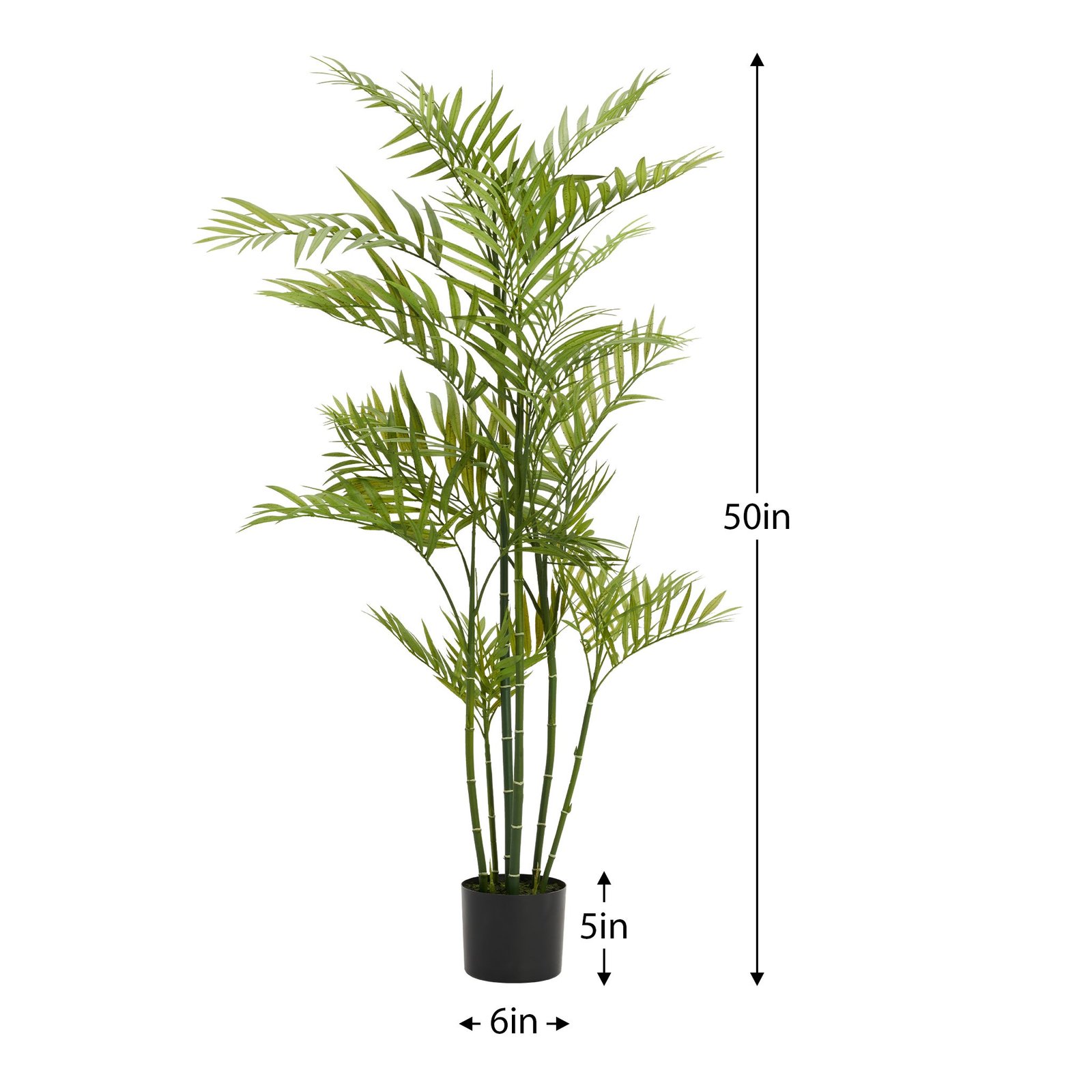 Add a welcoming touch with this large faux palm tree plant. Perfect for a living room or entry way this realistic looking tree can easily fit into a favorite planter for instant appeal. Dimensions: Pot. 6d x 5h”. Total height 50h