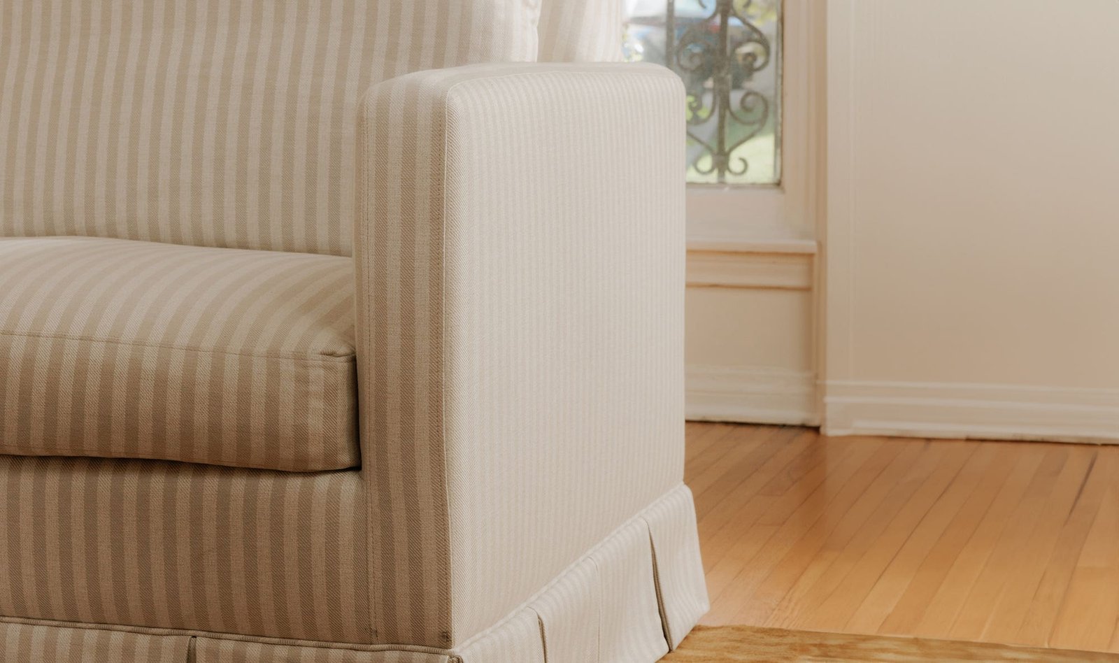 Gillian Segal for Moe’s The Pellicano sofa presents a romantically skirted silhouette artfully pleated while echoing the enchanting essence of Italy. Upholstered in a hardwearing Performance Fabric in a versatile beige stripe it provides forgiveness to everyday wear while evoking the same beguiling charm as its namesake Hotel Il Pelicano. Each curve and hue whispers tales of Italian escapades inviting a sense of refined nostalgia with a touch of poetic grace.. Dimensions: 99.0? W X 37.0? D X 34.5? H