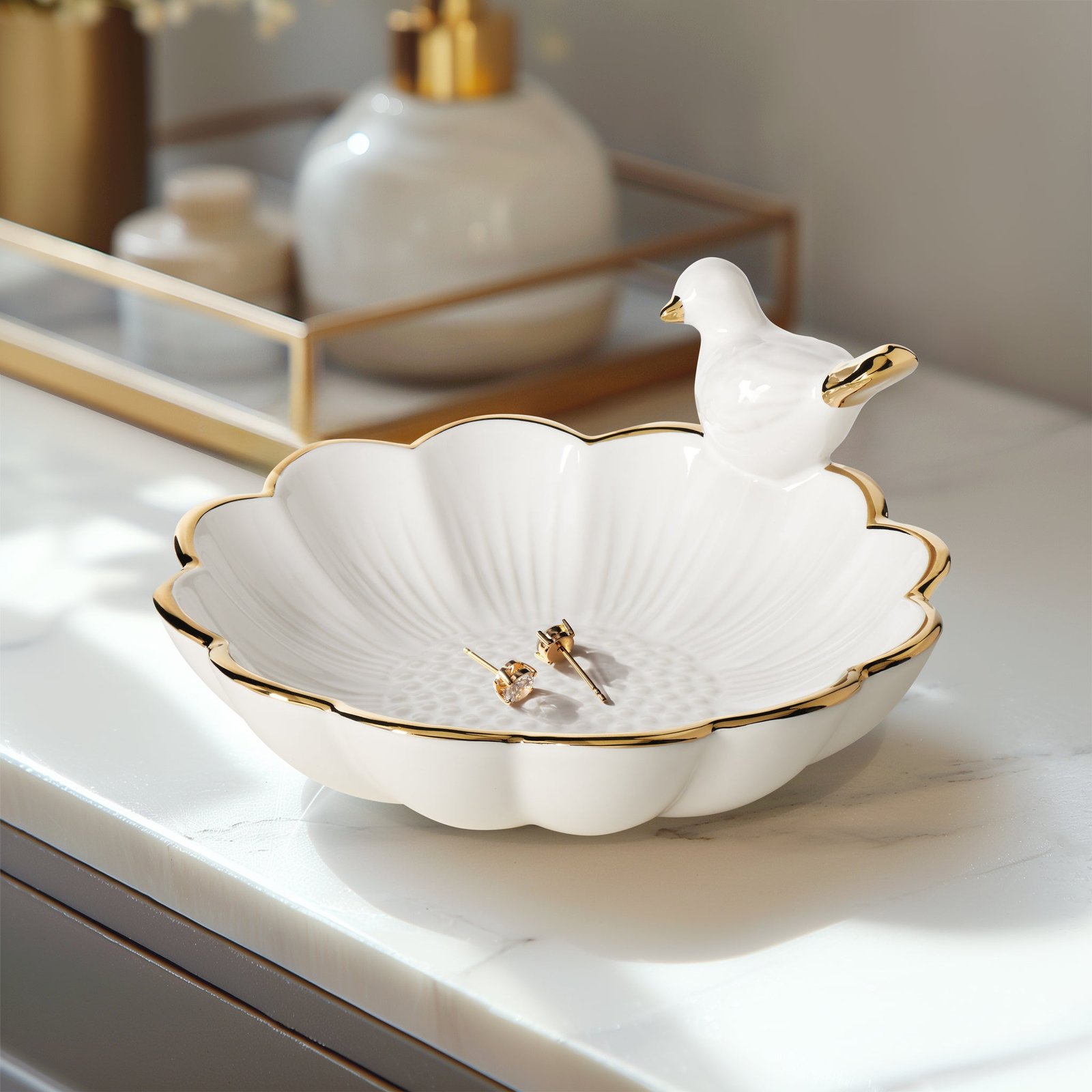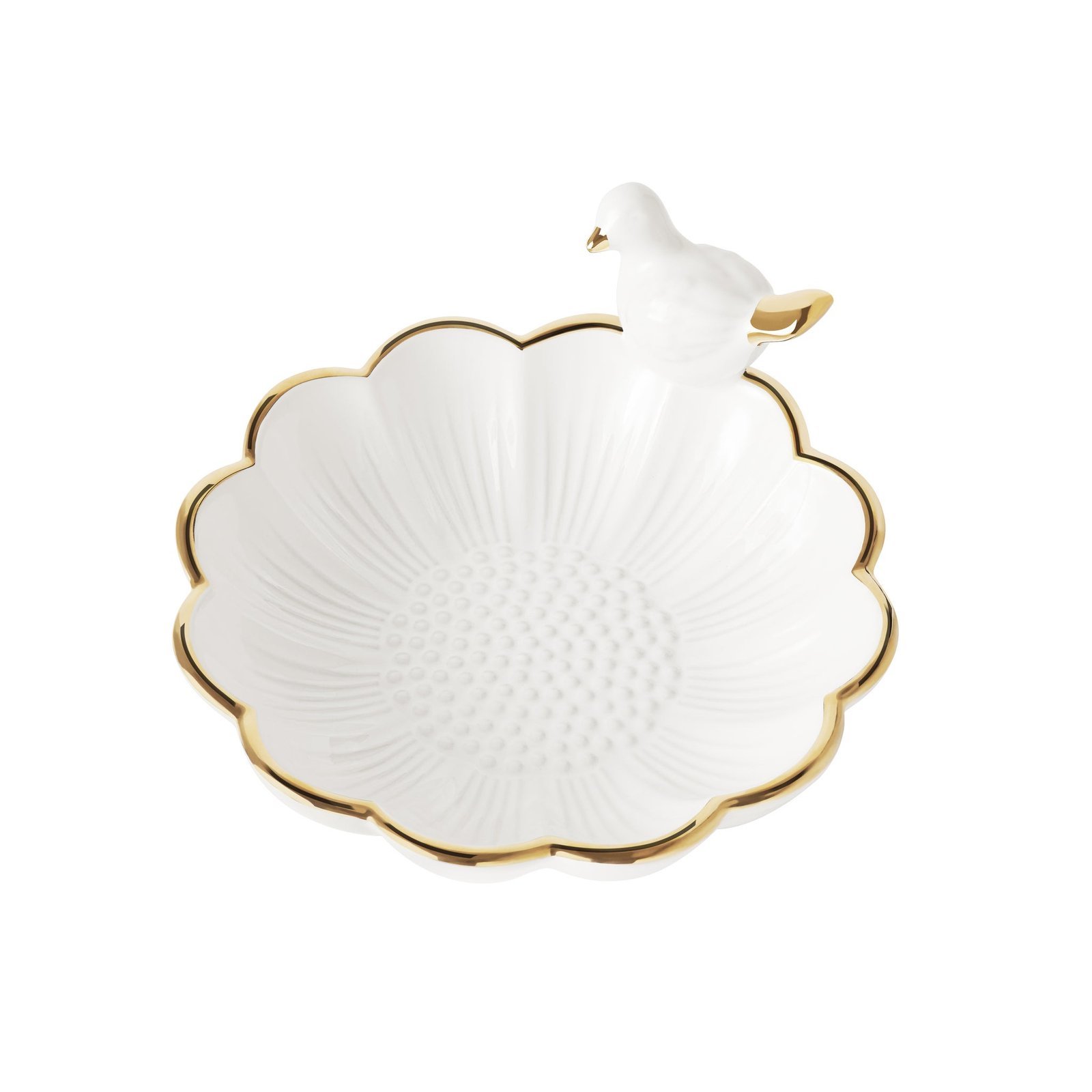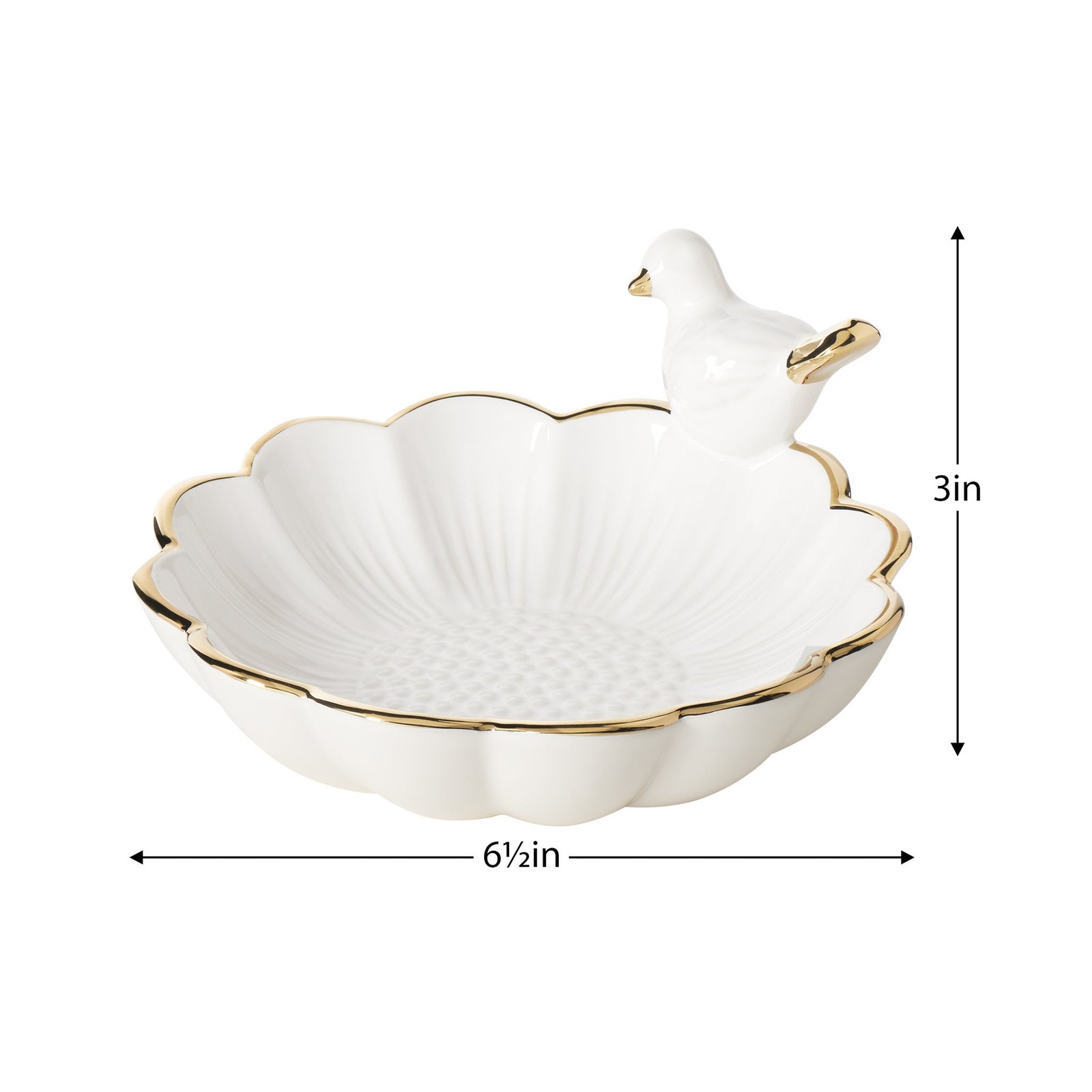 Elevate your decor with this ceramic flower-shaped decorative dish featuring an elegant gold trim and a charming bird perched delicately on the rim. Designed to add a touch of sophistication to your vanity or console table this piece doubles as a stylish dish for keys or jewelry. The harmonious blend of floral aesthetics and functional design makes it a perfect accent combining utility with a graceful and whimsical aesthetic. Dimensions: 6.5 x 6 x 3h