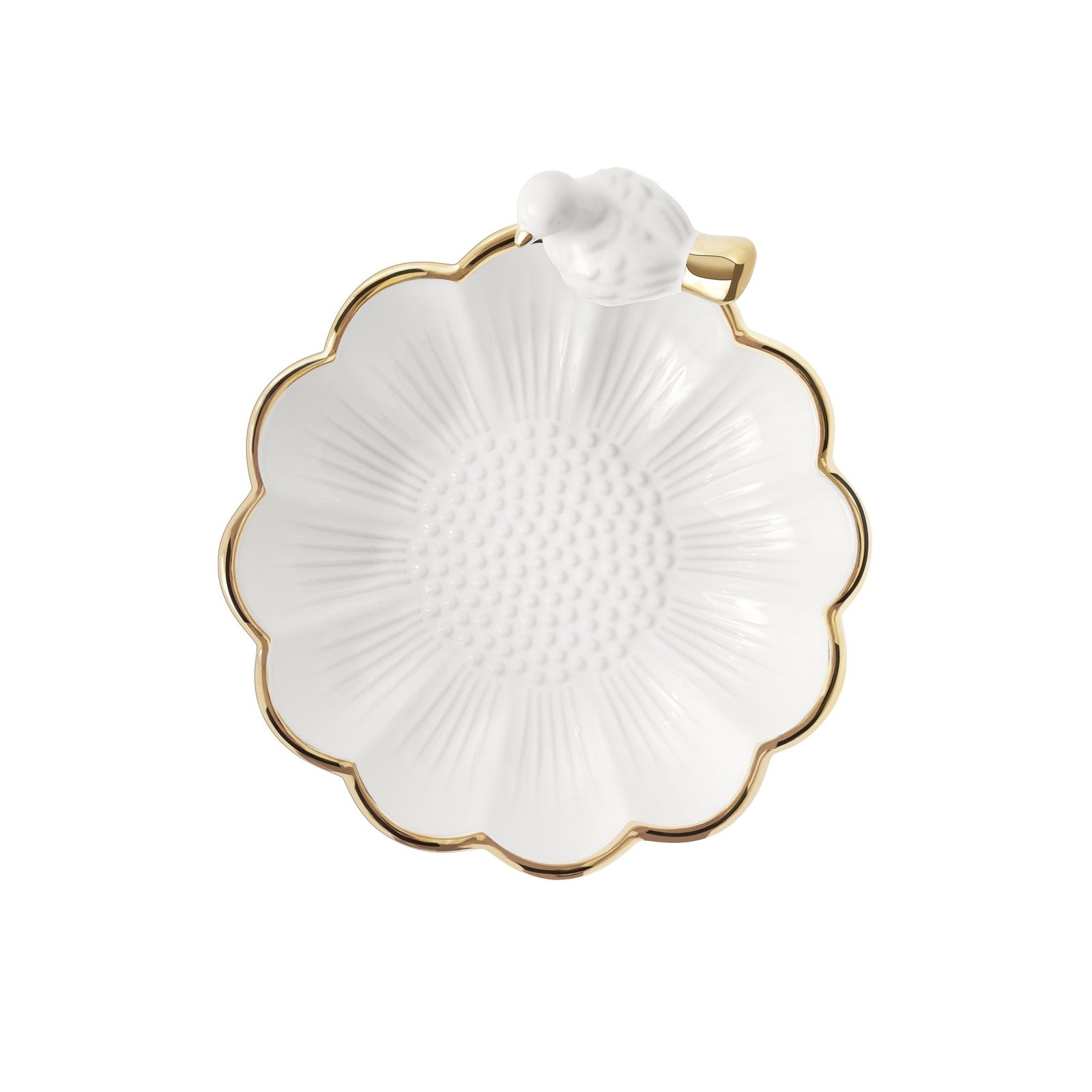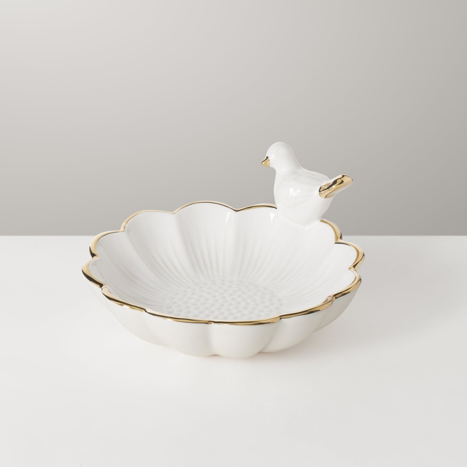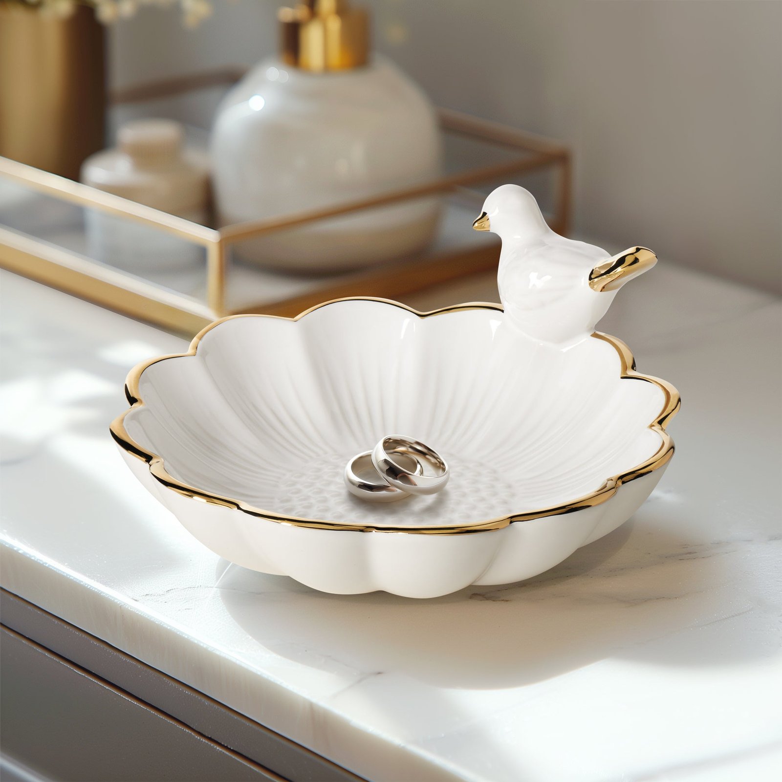 Elevate your decor with this ceramic flower-shaped decorative dish featuring an elegant gold trim and a charming bird perched delicately on the rim. Designed to add a touch of sophistication to your vanity or console table this piece doubles as a stylish dish for keys or jewelry. The harmonious blend of floral aesthetics and functional design makes it a perfect accent combining utility with a graceful and whimsical aesthetic. Dimensions: 6.5 x 6 x 3h