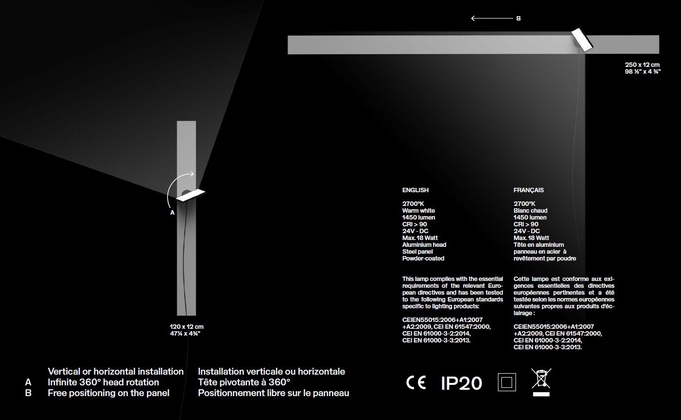 The linear version of the Piazza Lamp can be hung either vertically or horizontally to suit different applications. Available in different colours it gives great sculptural impact to its architectural environment. . Dimensions: 473/4”W x 11/2”D x 43/4”H