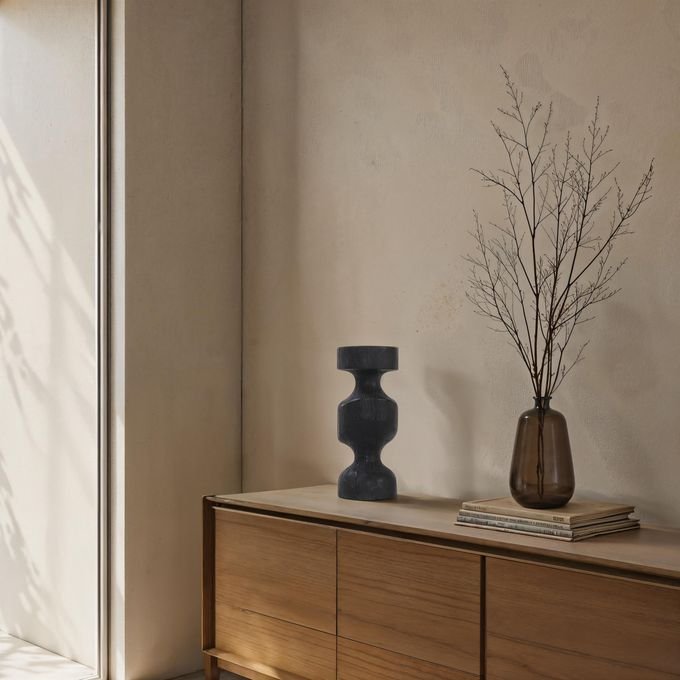 Taking the designers? tip to always include a touch of black in every room is easy thanks to this striking statue from Steven Sabados. The Canadian television host artist and designer created this decorative object from mango wood treated with a black burnt finish for added drama. Measuring 12 inches tall this angular and geometric piece will bring a fresh update to any modern interior.