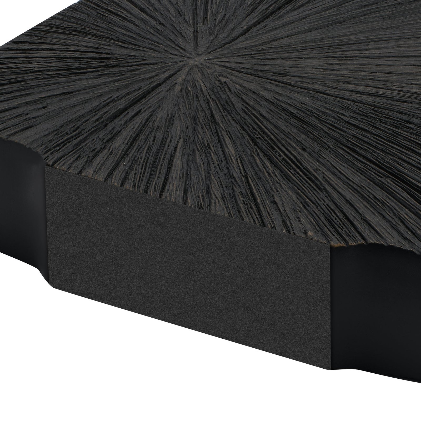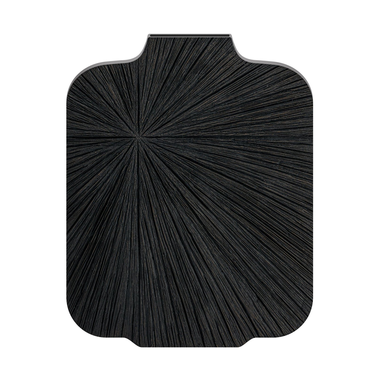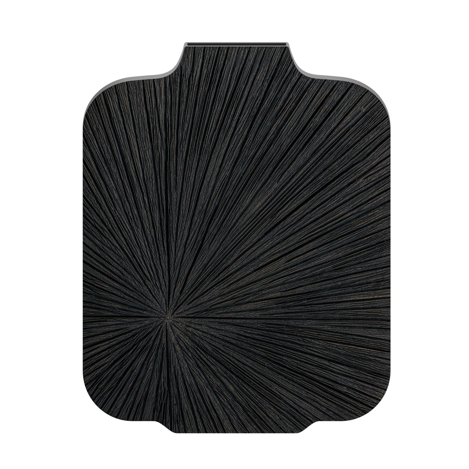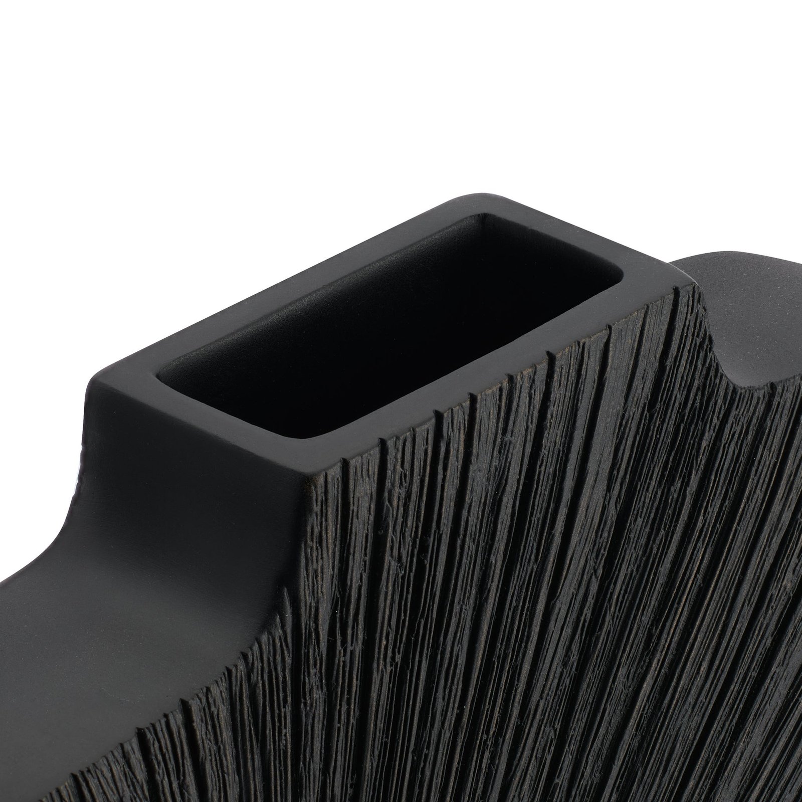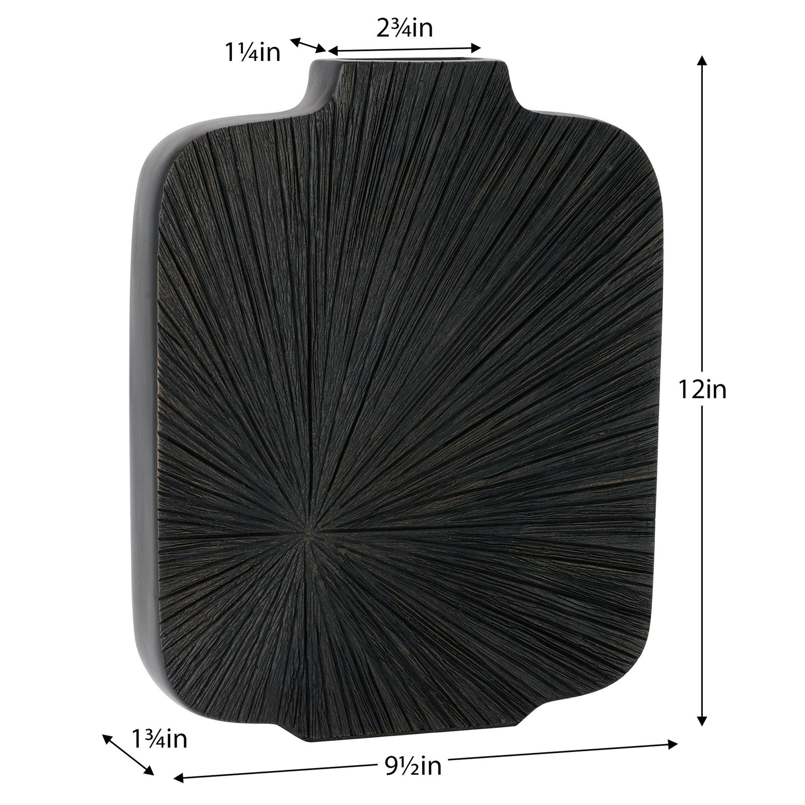 Sculptural and striking this slim resin vase features a radiating carved pattern and a rich black patina for a bold modern look. Its reversible design lets you switch up the style—one side flows upward the other downward—offering two distinct display options in one piece. Perfect on its own or paired with stems for a dramatic accent. Dimensions: 9.5 inch length x 1.75 inch width x 12 inch height. Vase Mouth: 2.75 x 1.25 inch