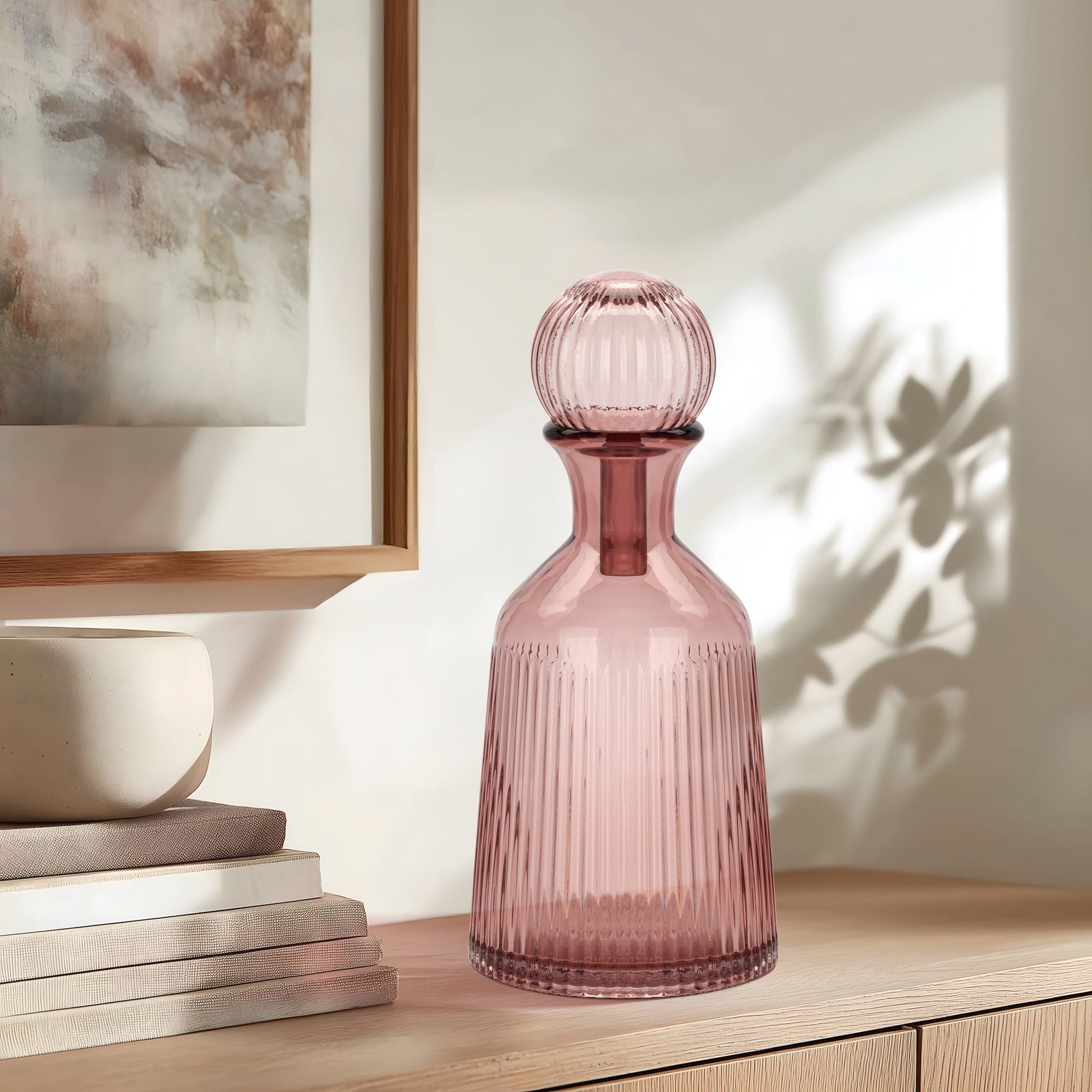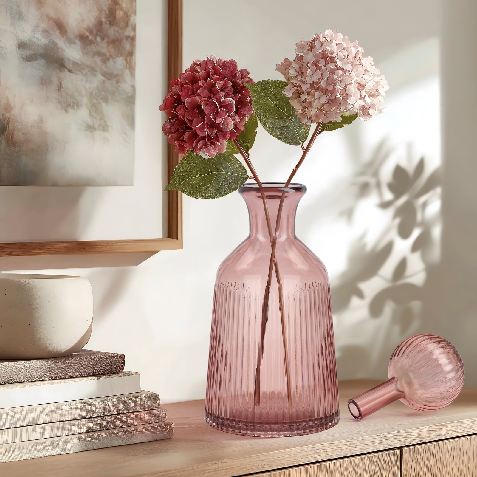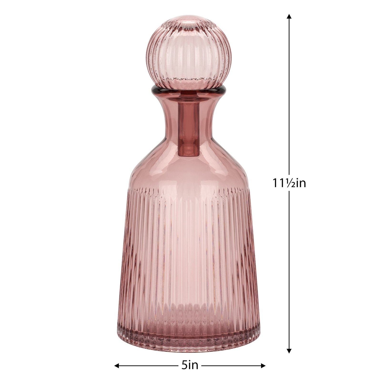 This ribbed glass vase with a matching ball stopper is a standout accent that brings instant style to any space. The textured glass and sculptural form make it feel elevated and unique whether displayed on a shelf or table. With its modern-meets-vintage vibe it’s an easy way to refresh your decor. Dimensions: 5 inch diameter x 11.5 inch height