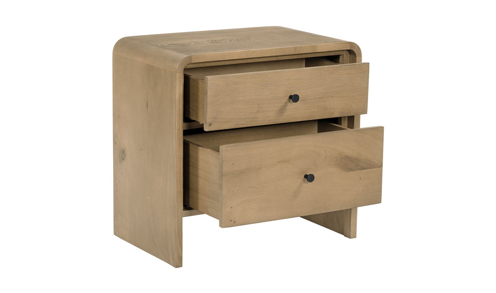 Featuring a unique waterfall edge and overhang detailing the Riley nightstand offers captivating visual interest underscored by its solid oak construction. The seamless design is a timeless blend of sophistication and practicality with ample two-drawer storage.. Dimensions: 26.0? W X 16.0? D X 25.0? H