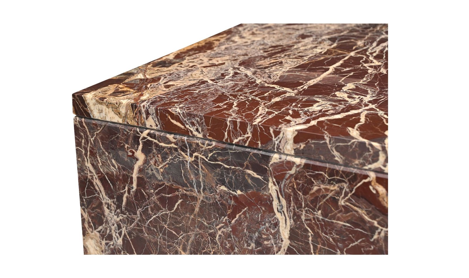 The bold simplicity of the waterfall design speaks volumes with the Rosa coffee table’s versatility. Crafted from beautiful Rosso Levanto marble renowned for its vibrant red hue and striking gold veining each piece is singularly impactful. This piece commands attention as a statement of natural elegance.. Dimensions: 40.0? W X 30.0? D X 16.0? H