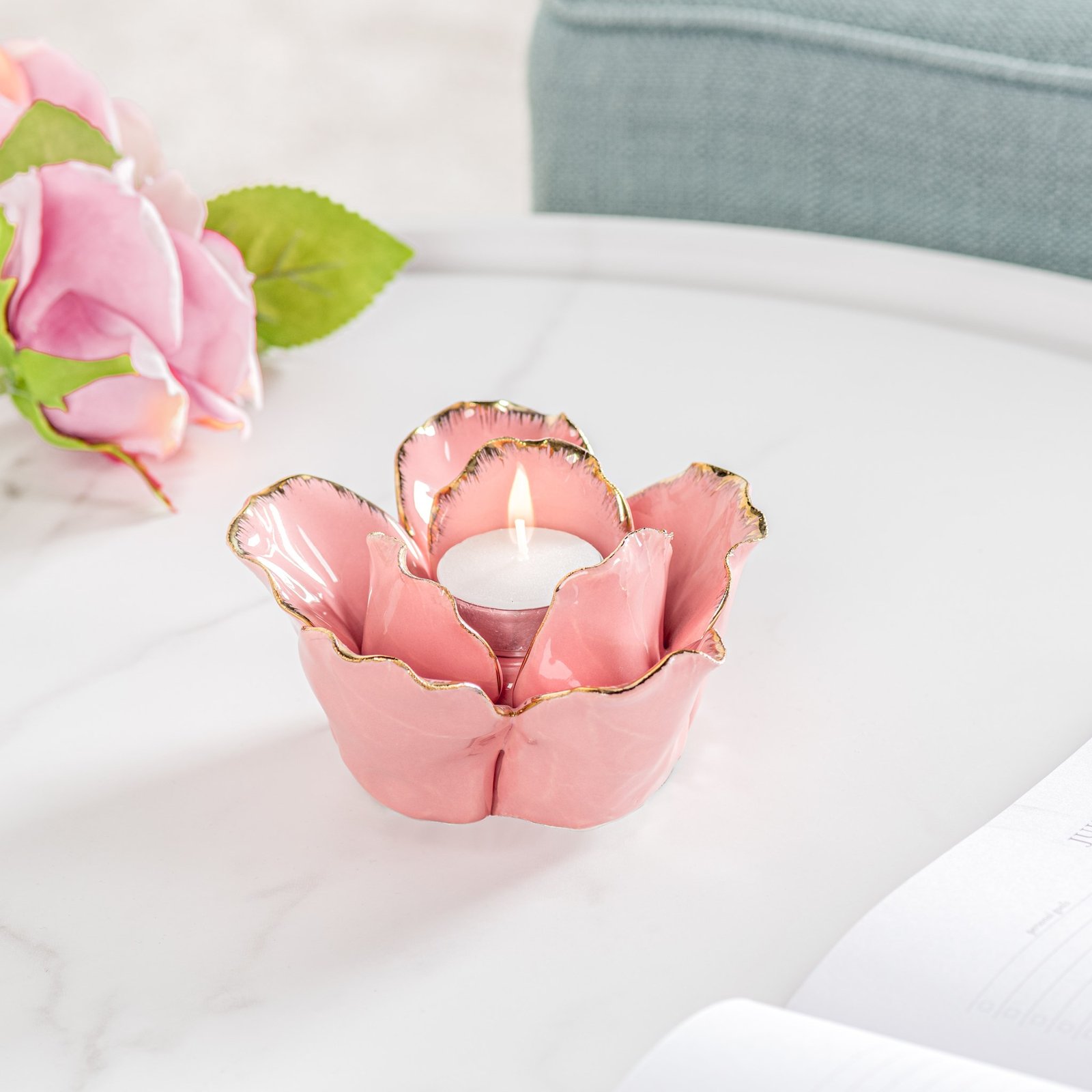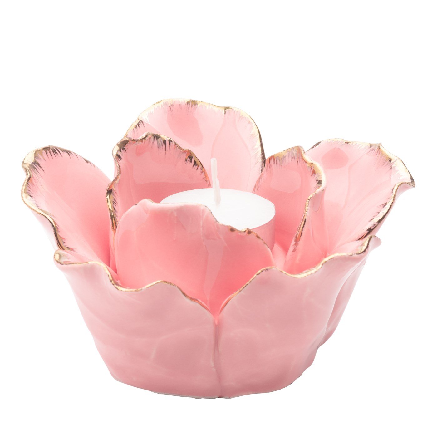 Rose Gold Tipped Pink Flower Cup 5 Inch Diameter Ceramic Tealight Holder