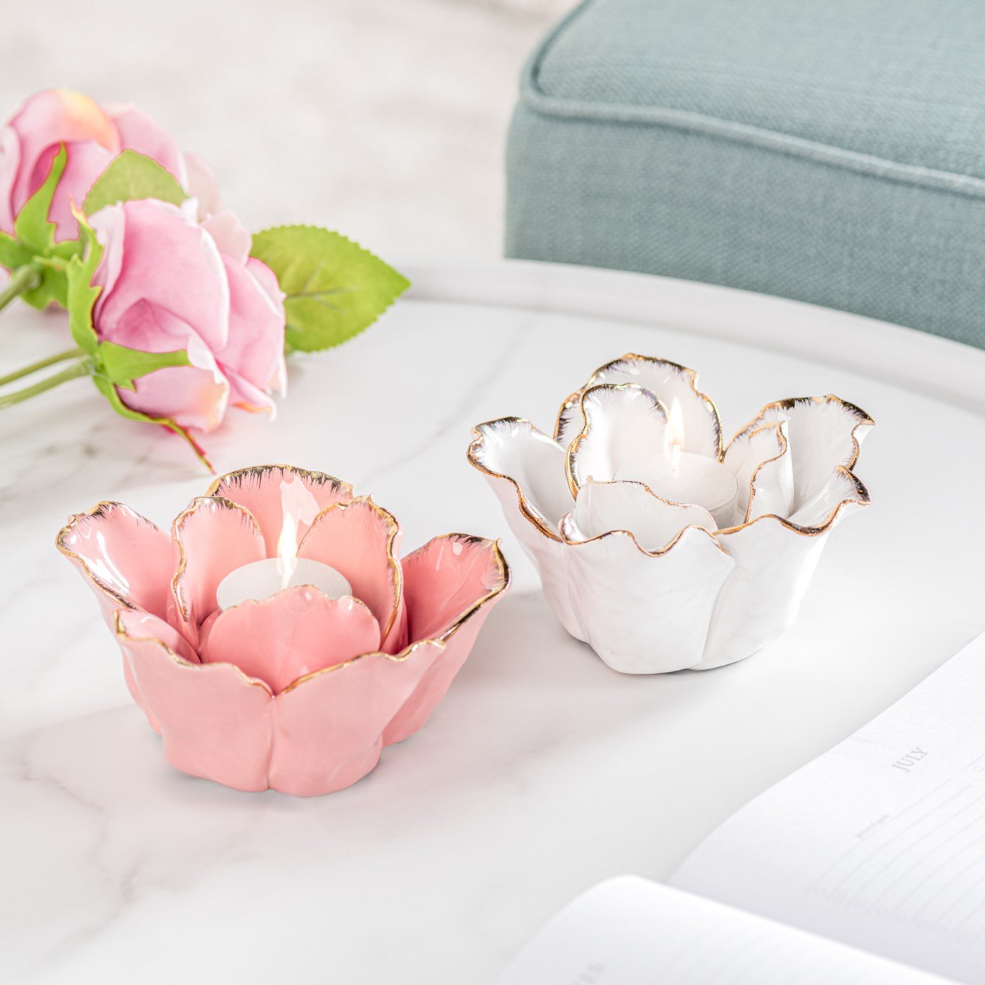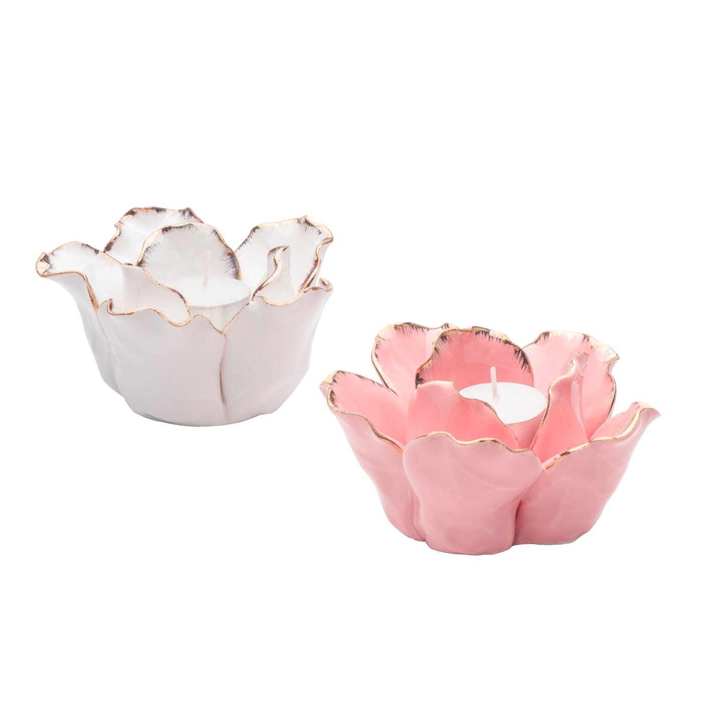 Create a look of romance and beauty with this gold trimmed ceramic flower shaped tealight holder. Place on a shelf or try a cluster on a table to create a gorgeous centerpiece. Dimensions: 5d x 2.75h”. Fits maximum 1.5″ votive or a standard tea light