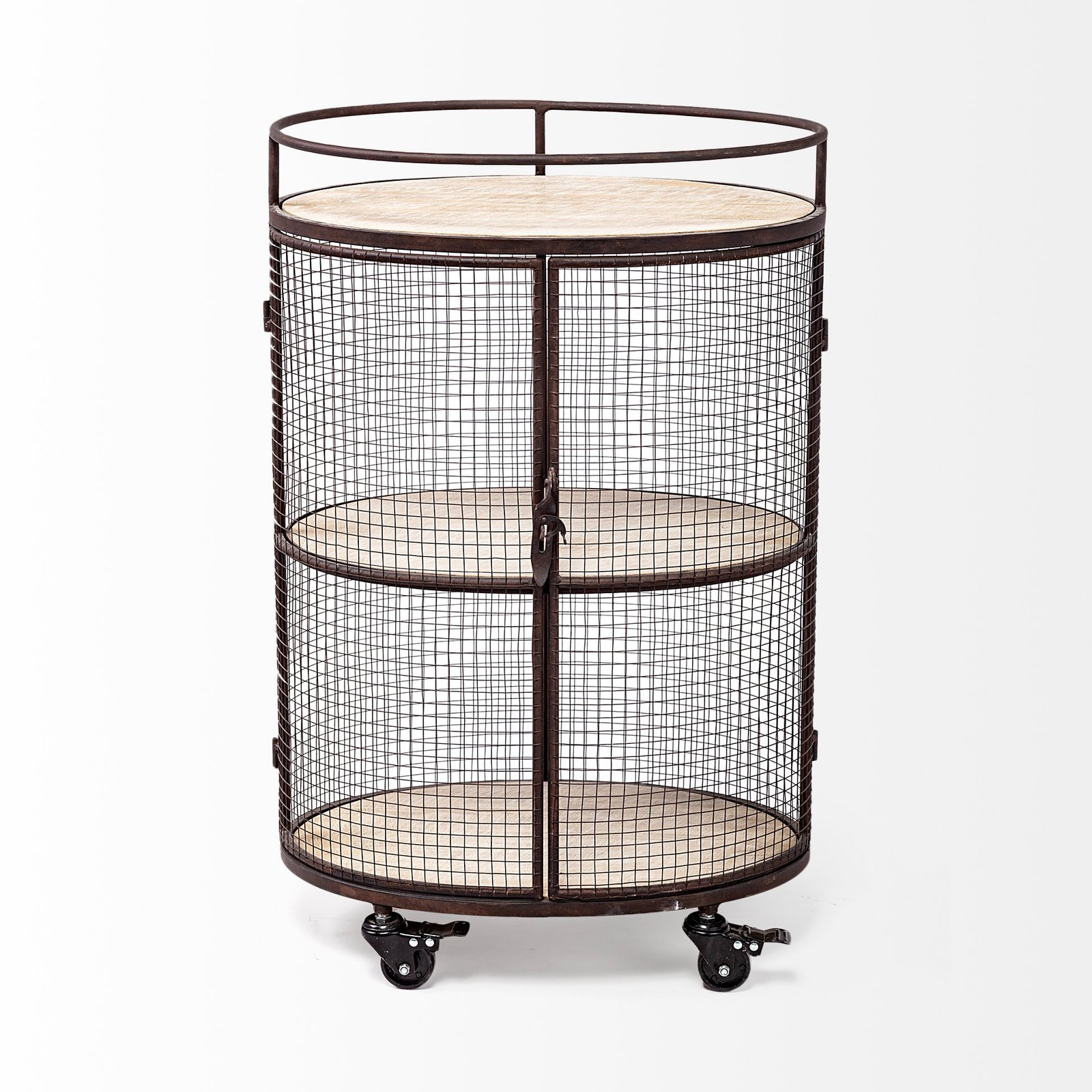 Meticulously crafted from wood and metal the?Saliuti II is an opulent?bar cart that is sure to look great in your space. Shaped like a cylinder the?Saliuti II sports three elliptical?shelves crafted from fir wood two of which are enclosed within meshed metal doors. The top-most shelf has raised metallic edges to keep your belongings intact. Flaunting a juxtaposition of light wood tones and matte-black metal tones the Edna looks gorgeous in spaces based on the Farmhouse Lakeside and Mercana Modern design styles.. Dimensions: 20.3L x 13.3W x 31.5H