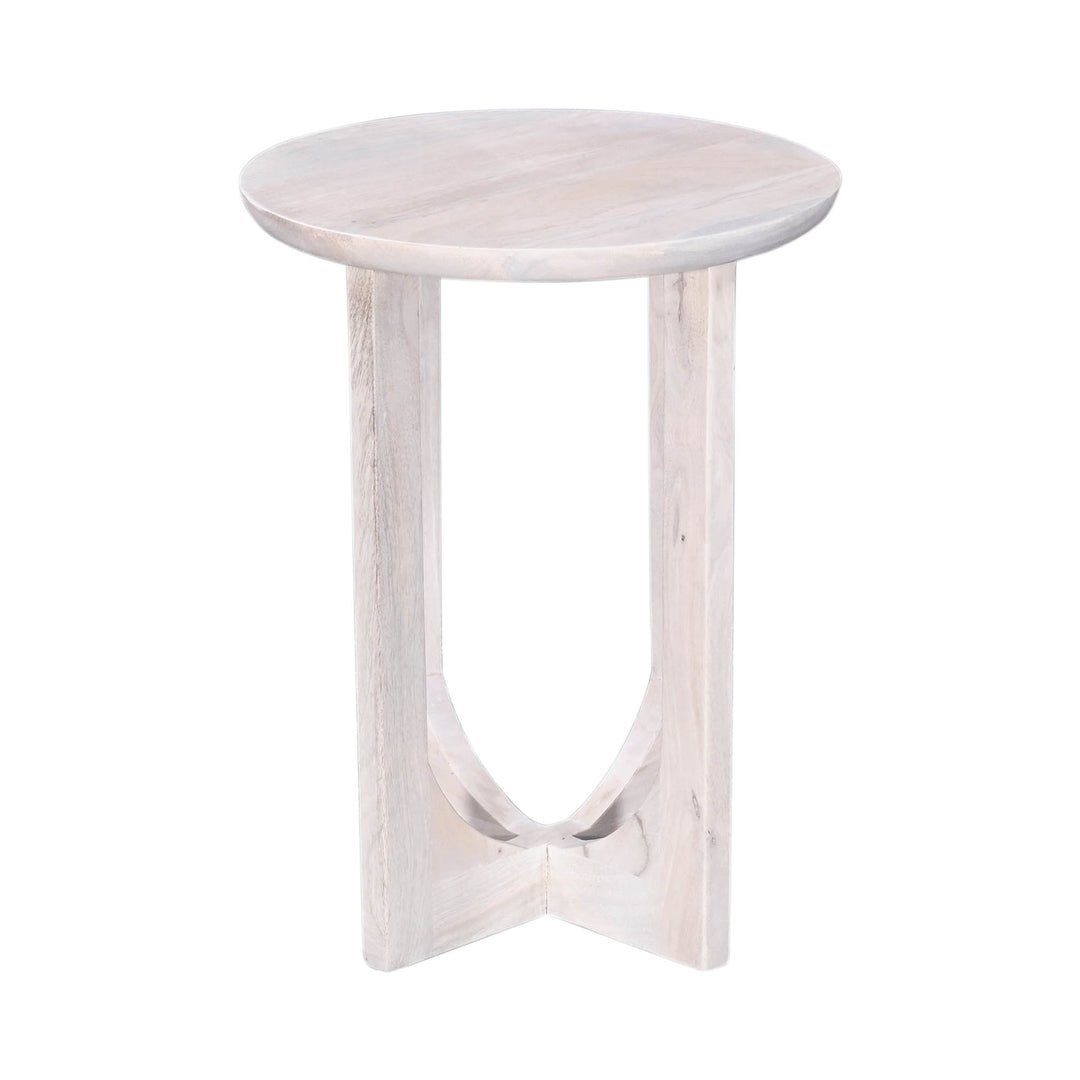 Designed to perfection. it stands as the ideal side table for any living space or entertainment area. . The unique arch-shaped legs lend a timeless elegance. seamlessly blending with any style or decor scheme. . The subtle white wash finish adds a touch of sophistication without overpowering existing aesthetics. making it a truly functional and versatile piece. . Dimensions: 15 x 15 x 20 ; 7lbs
