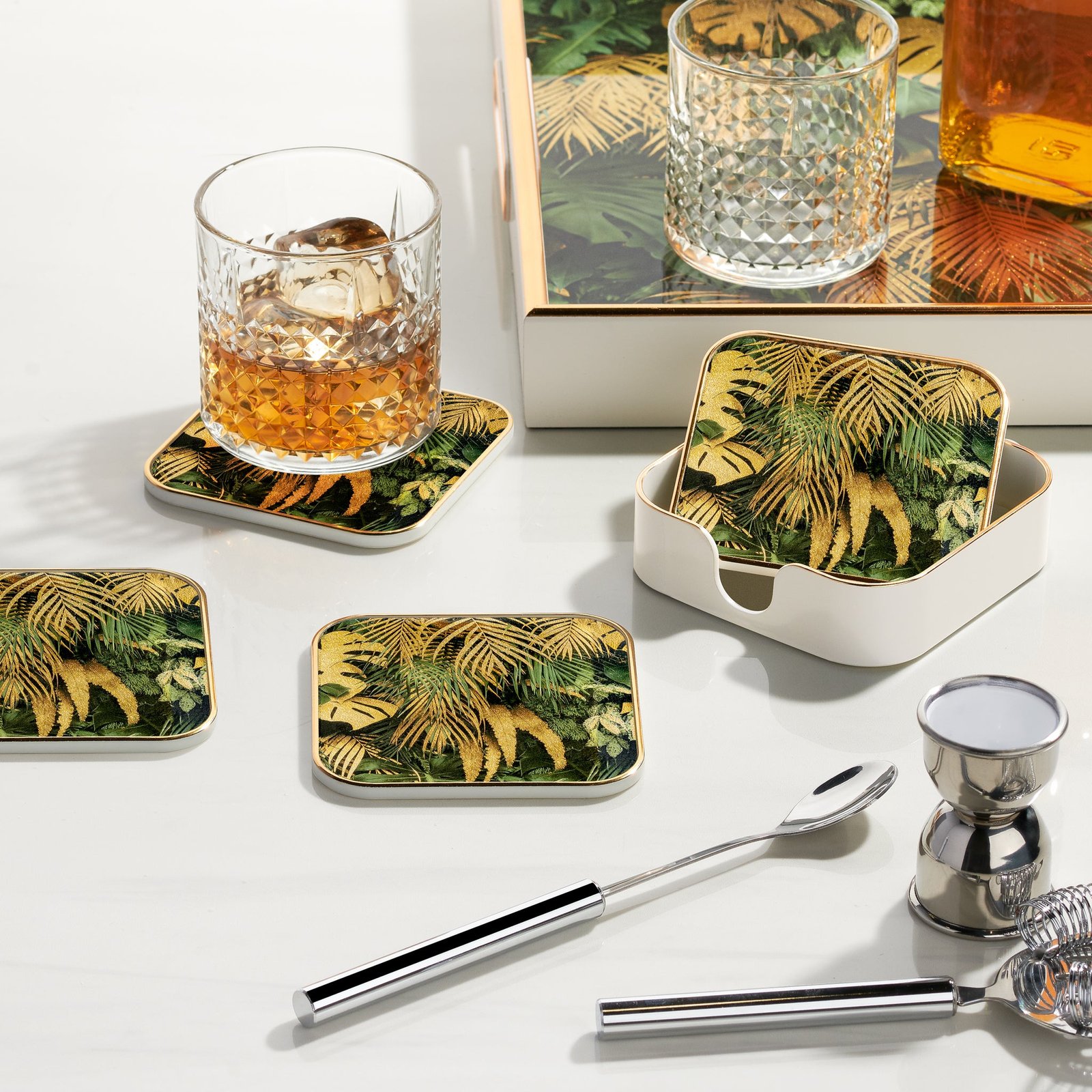 Savoy Gold Trim 2 Piece Square Tray Set – Tropical Leaves