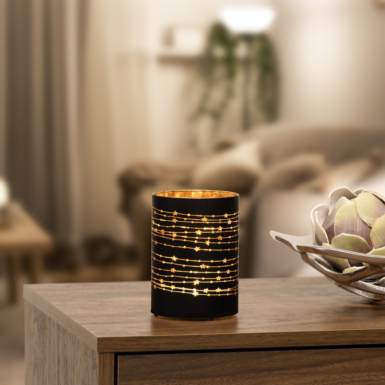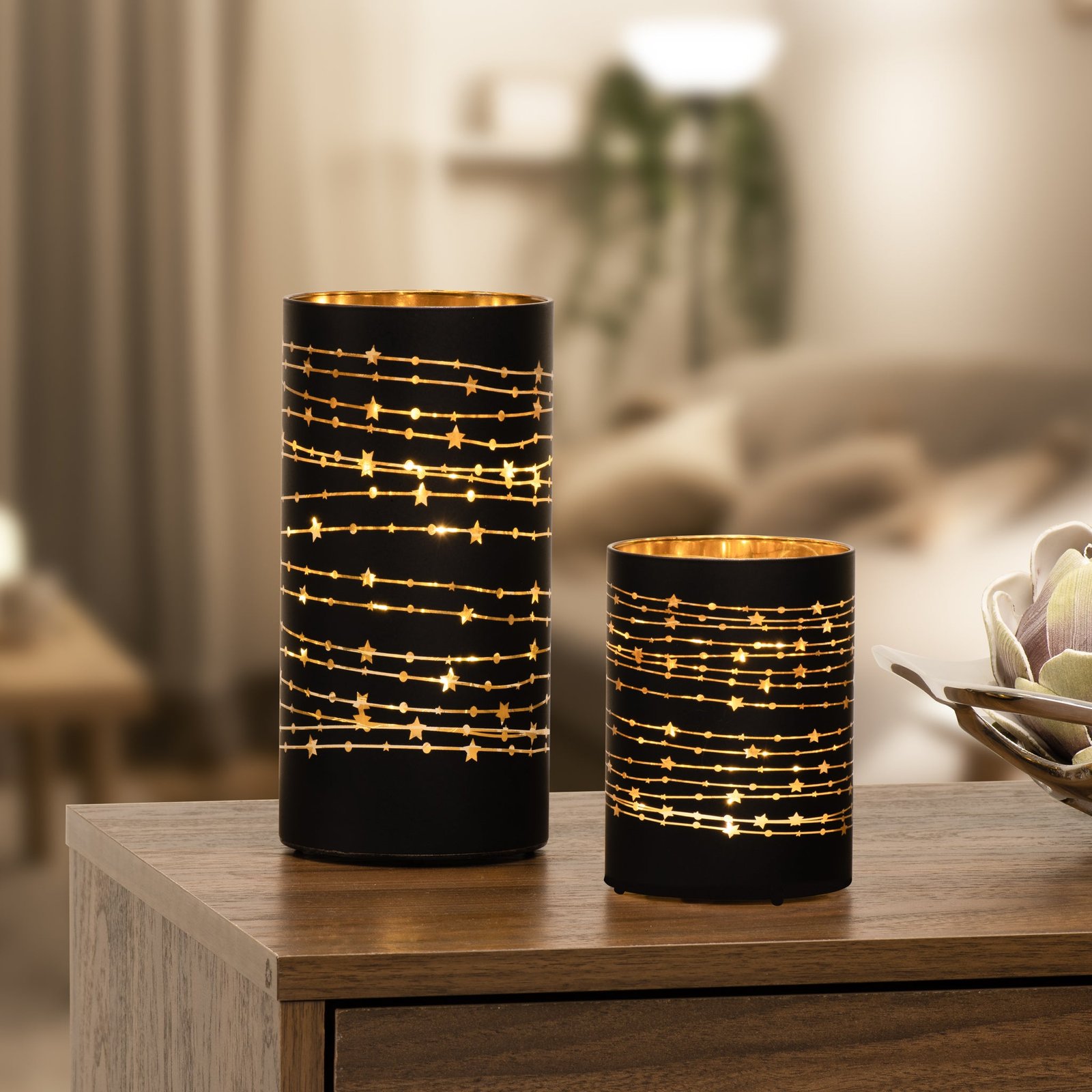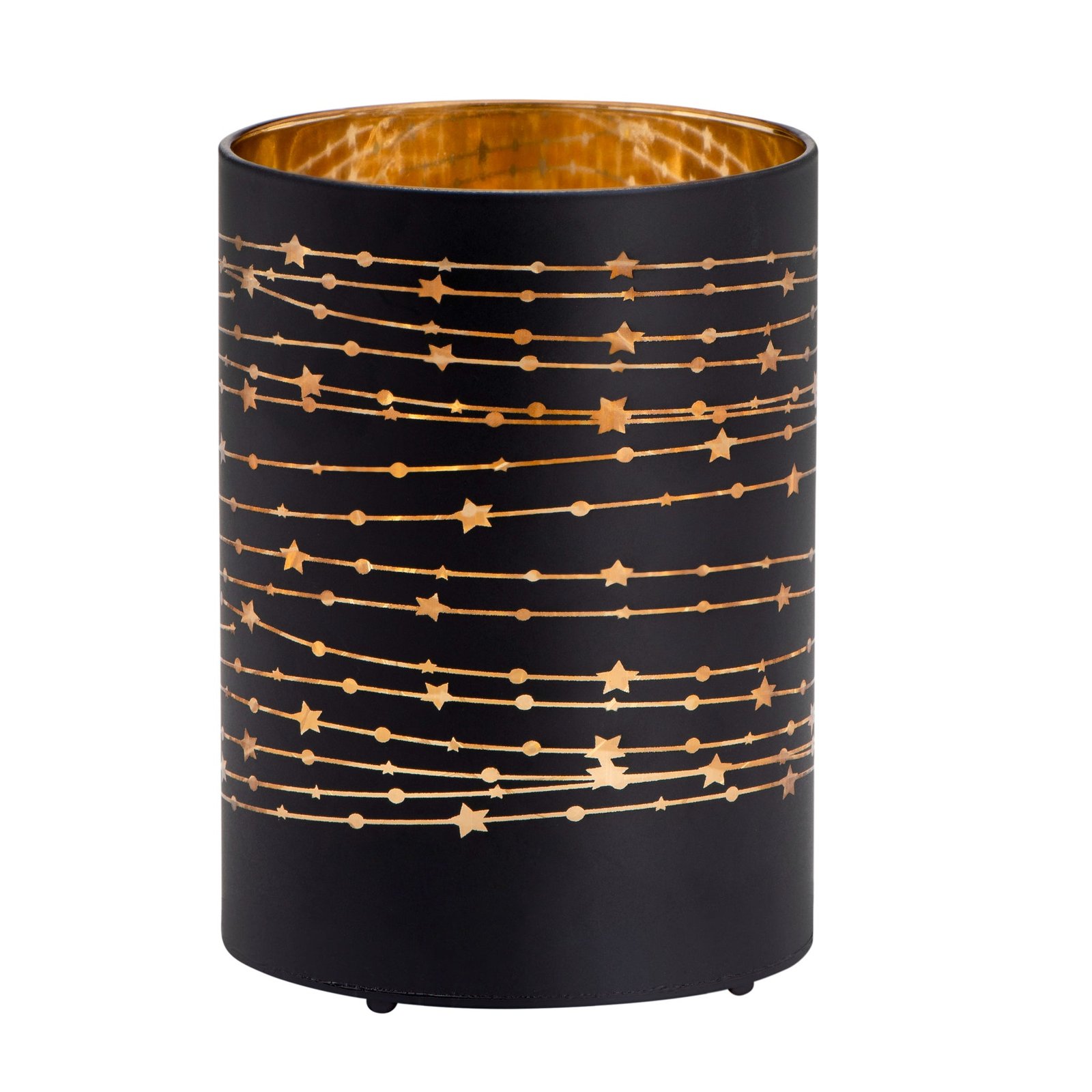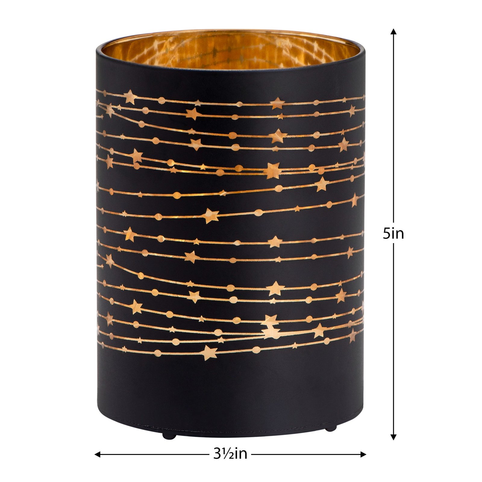Give your space a cozy and inviting feel with this LED hurricane lamp. Micro LED lights shine from within and reflect the gold tone through the silhouette star design shape on the outside of the black glass lamp. Place on a shelf or table to instantly make your space shine. Dimensions: 3.5d x 5h