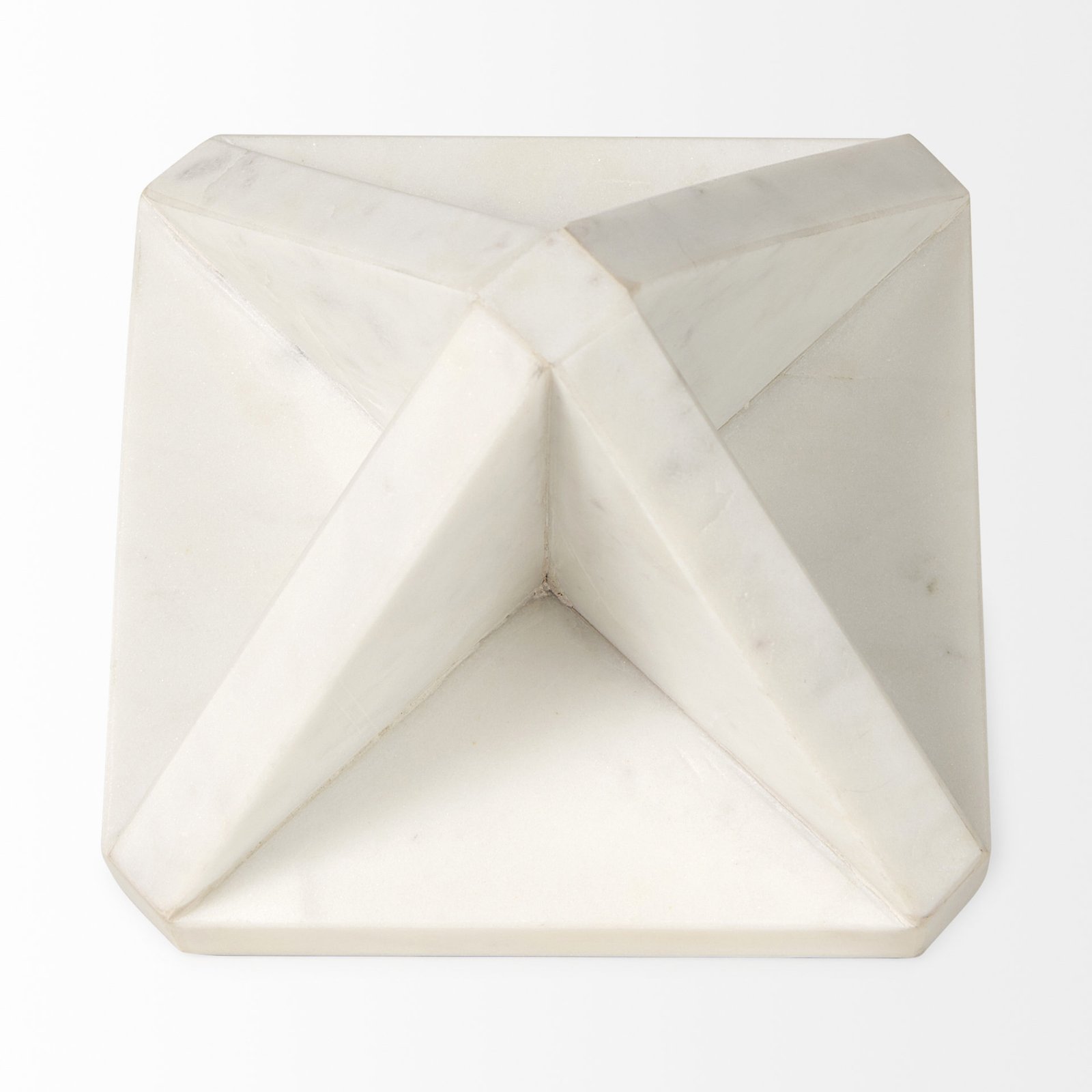 The Sophia measures 5.5″ L x 5.5″ W x 8.5″ H.?The Sophia is crafted from white marble giving the object a clean and fresh look.?The Sophia is finished in a beautiful white marble with grey veining throughout. *Marble is a natural material. Each piece has its own beautiful intricacies and some may carry naturally occurring fissures. Please expect variations in color and texture.?This decor stand and its geometric design provide multiple ways for it to sit- making it versatile in nature.. Dimensions: 5.5L x 5.5W x 8.5H