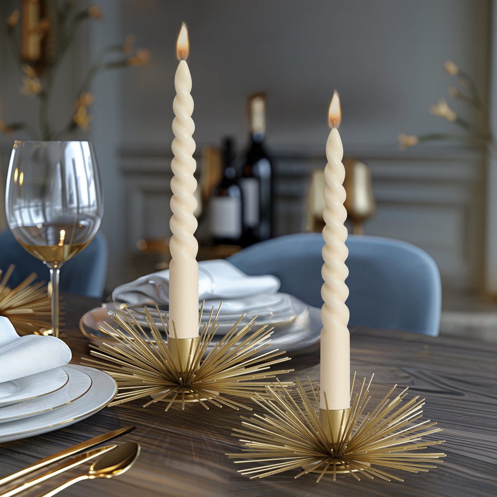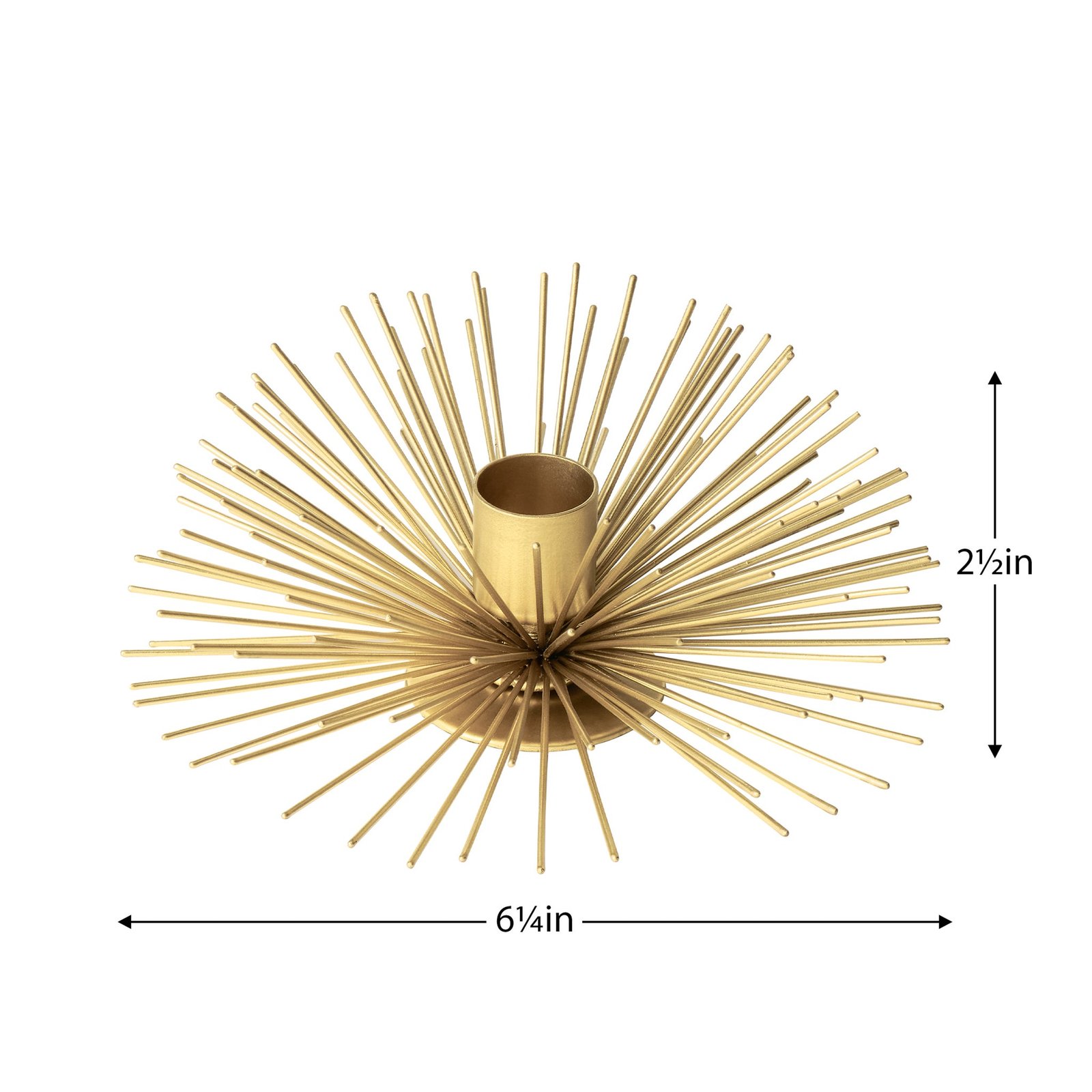Illuminate your space with a touch of opulence using our set of two gold spike ball taper candle holders. Crafted with precision these holders combine modern design with a hint of glamour creating a captivating focal point for any room. The golden finish adds a luxurious touch making these candle holders both stylish accents and functional pieces for enhancing the ambiance of your home. Ideal on a mantel or console table or as a centerpiece on a dining table. Dimensions: Each. 6.25d x 2.5h