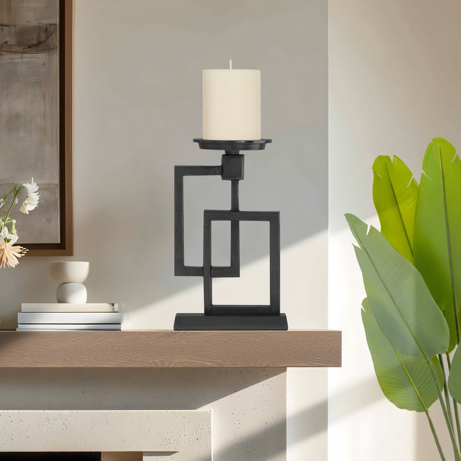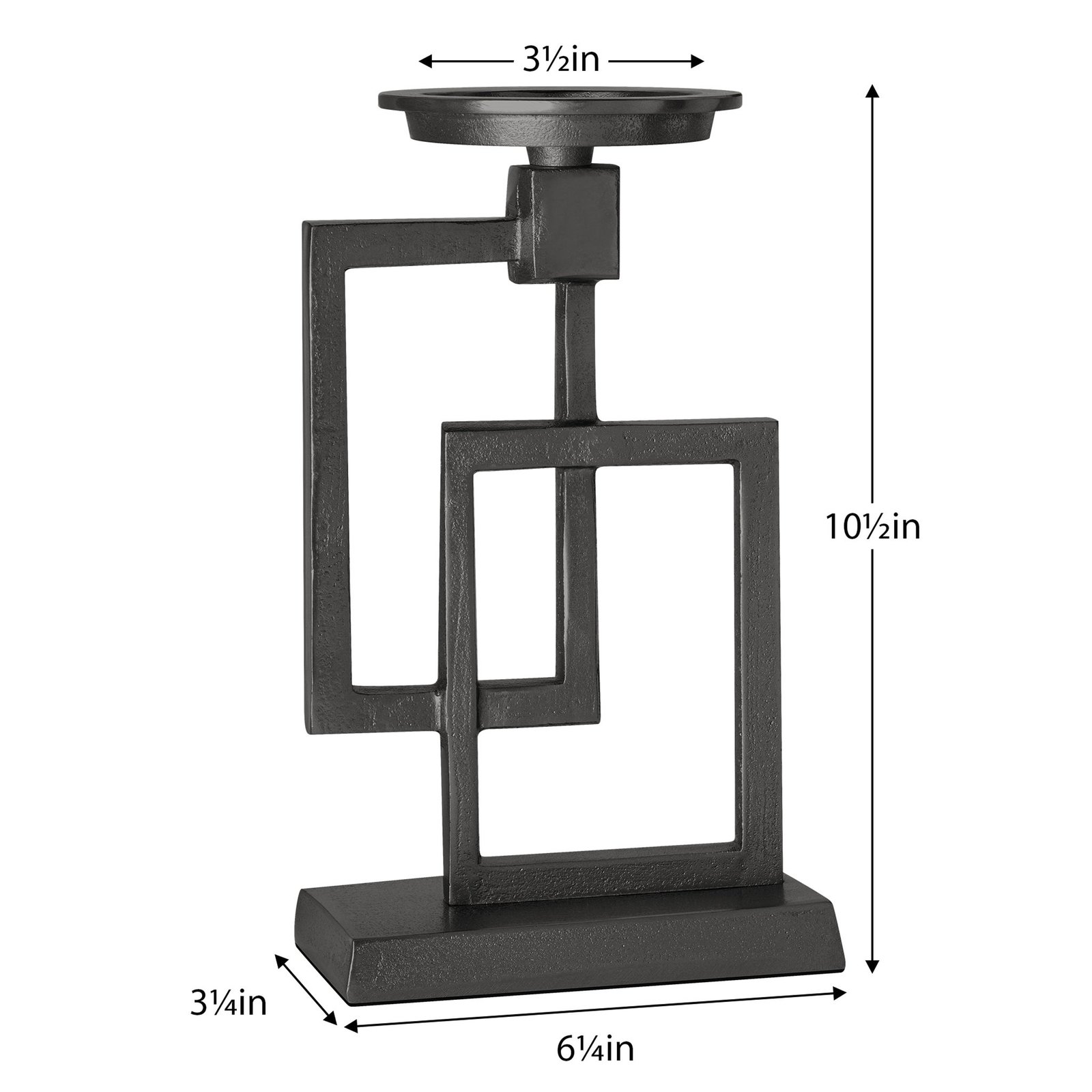 With a sleek black finish and a unique stacked-square form this aluminum pillar candle holder brings a touch of modern sophistication to your space. Its clean lines create a refined statement piece that elevates any candle display. Ideal for adding subtle luxury to your decor. Dimensions: 6.25 inch length x 3.25 inch width x 10.5 inch height