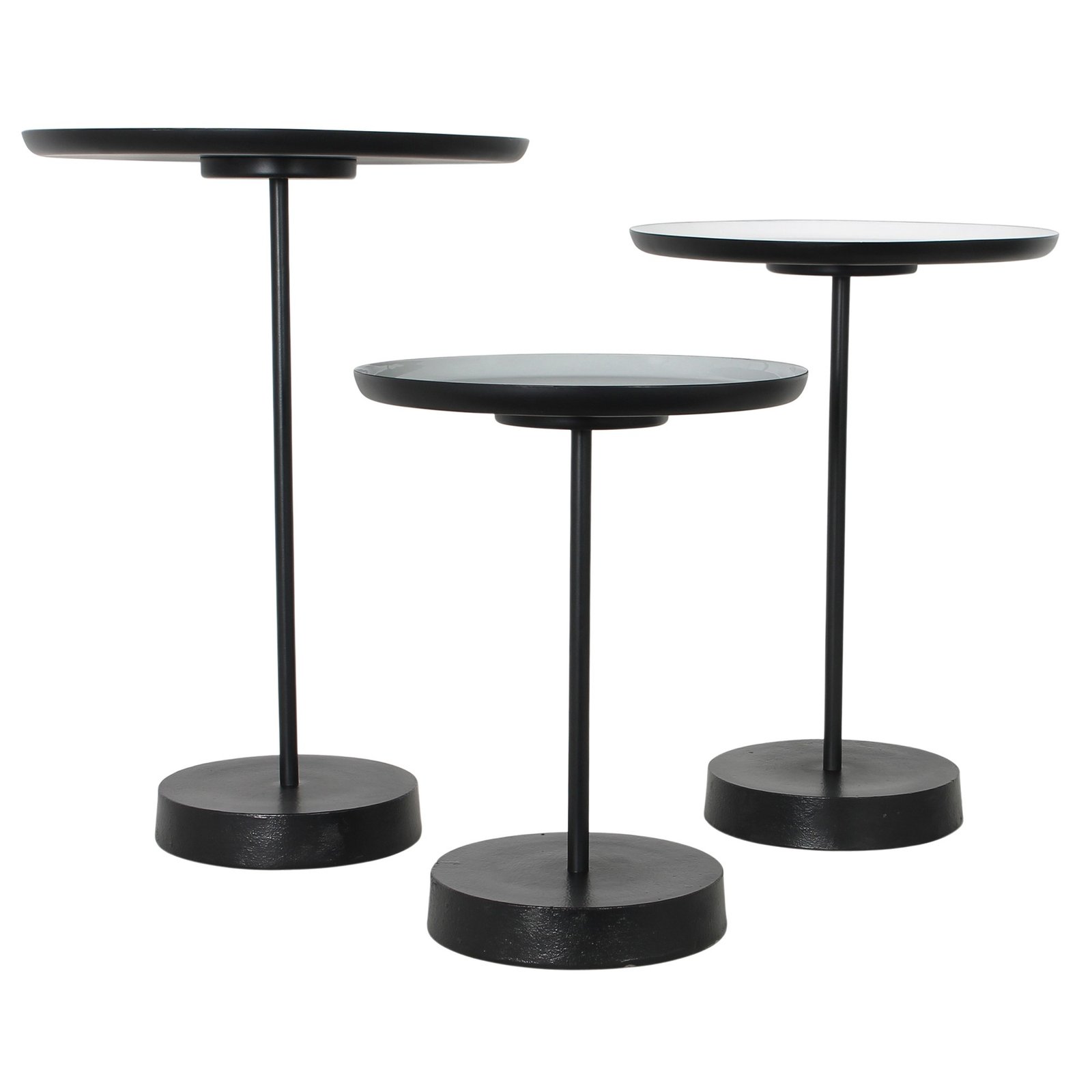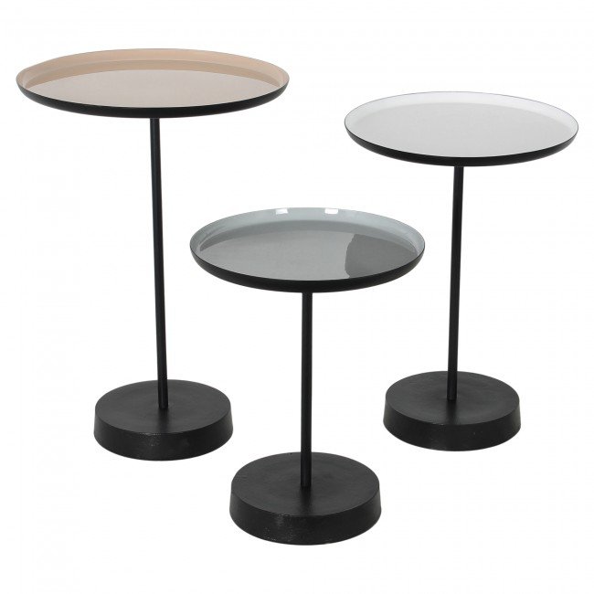 Set of three Tables Iron White beige & grey enamel finish Black powder coated finish Net Weight: 36lbs.Gross Weight: 41lbs.. Dimensions: