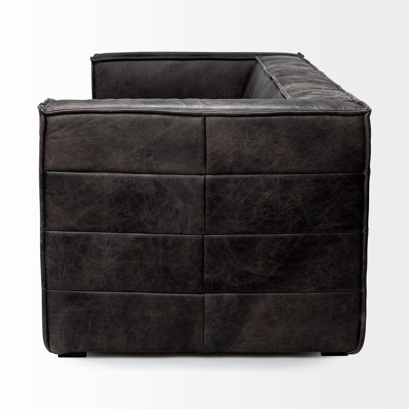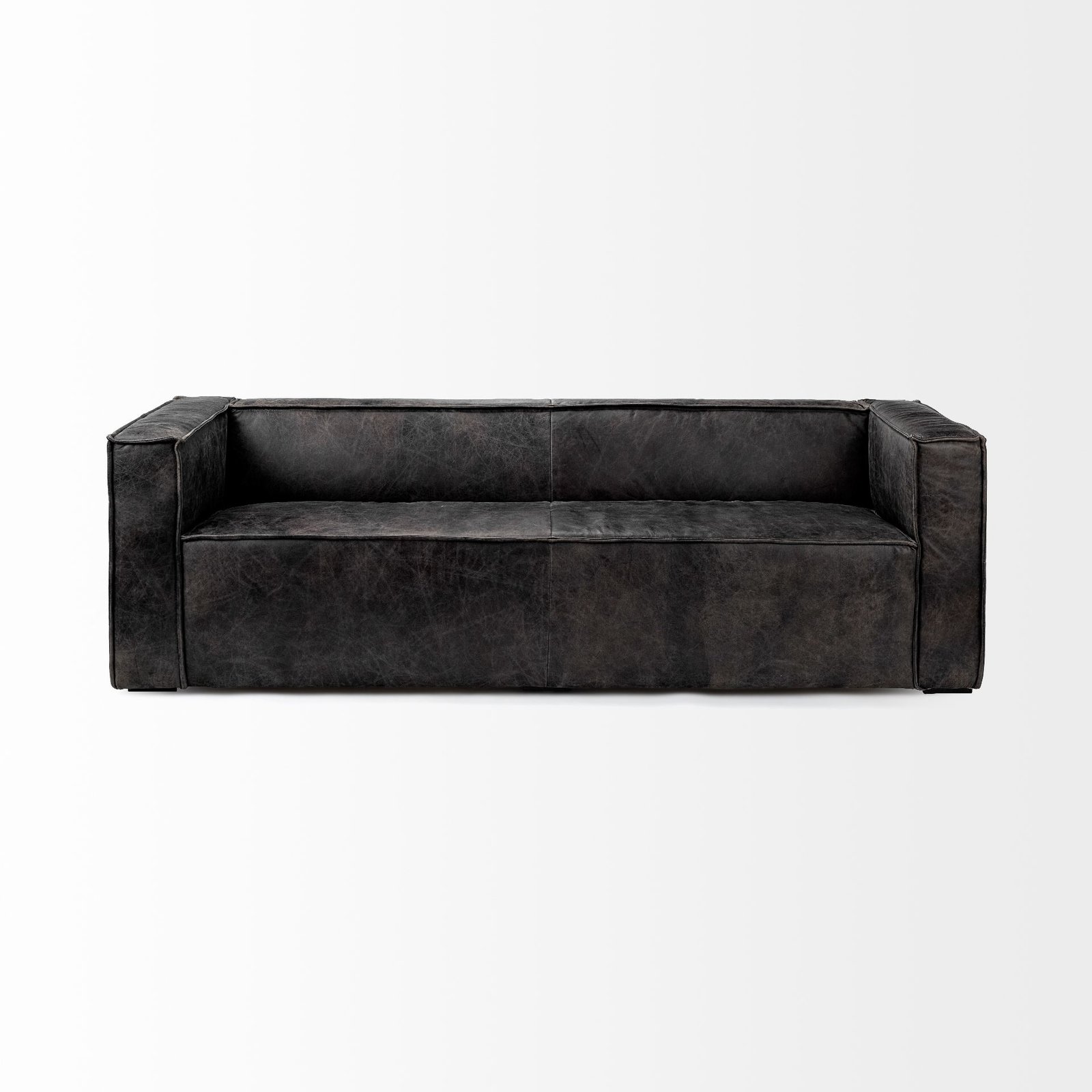Finished in a stone-grey tone the Stinson II is a posh tuxedo-style genuine-leather wrapped sofa from the Stinson series of living room furniture. It dons a french seam that runs along the entire body and adds to its ritzy look. Perfectly padded seating a sturdy wooden base and unparalleled comfort are all standard on the Stinson II making this luxurious sofa a perfect fit for spaces based on the Mercana Modern and Industrial design styles.. Dimensions: 91.0L x 35.5W x 27.5H