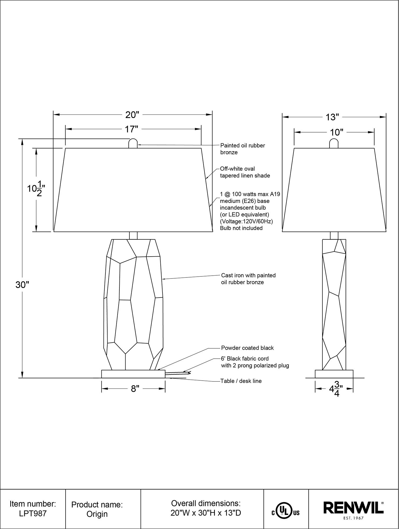 Table Lamp – Cast Iron – Oil Rubbed Bronze Finish – Iron – Black Powder Coated Finish – Off-White Linen Shade – 3-Way Switch – Max. 100W – E26 Socket. Dimensions: OAH: 30″H SHADE: 10.5″H X DIA-20