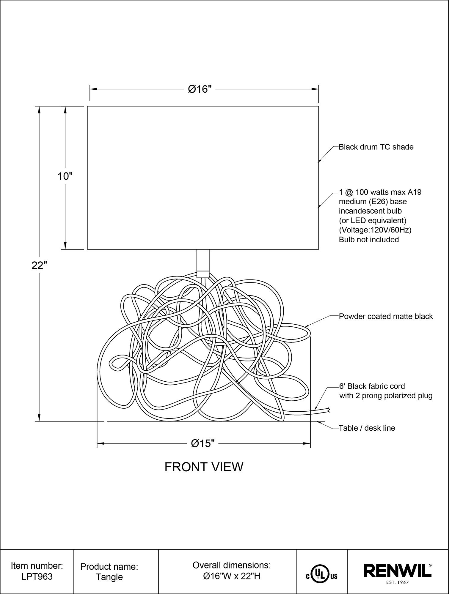 Table Lamp – Iron – Black Powder – Coated Finish – Black Cotton – Shade 3-Way Switch – Max. 100W – E26 Socket. Dimensions: OAH: 22″H SHADE: 10″H X DIA-16