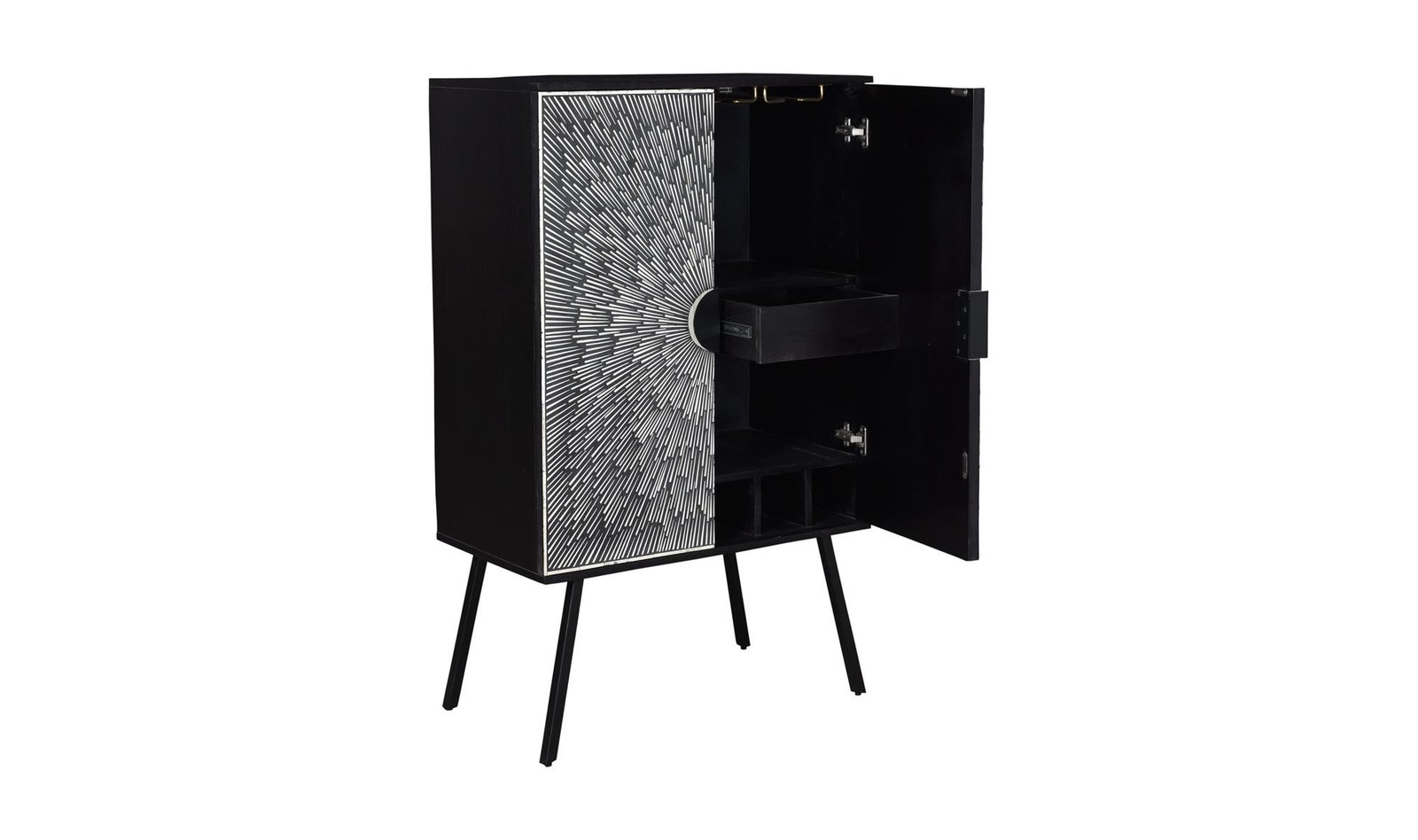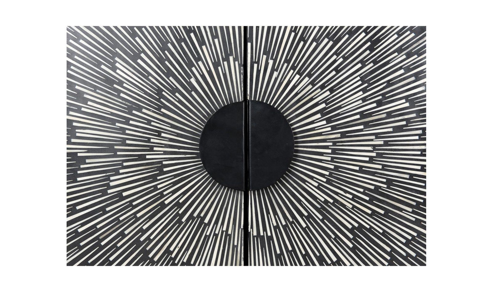 Shine on with the Sunburst wine cabinet. This black-and-white camel bone and resin affair will leave you starstruck every time you reach for a bottle. Two wide swinging doors leave plenty of space for your wine collection.. Dimensions: 32.0? W X 17.0? D X 51.5? H