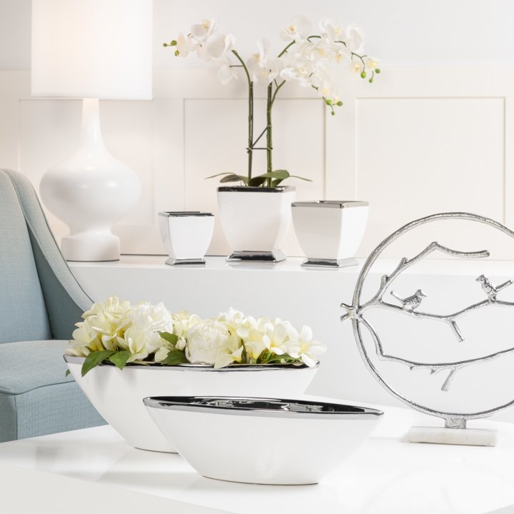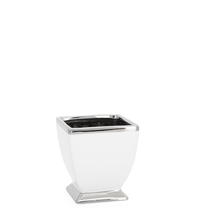The silver trim perfectly accents the smooth white ceramic glaze of this modern pot. Fill with a gorgeous bouquet or a lively plant for a classic display. Dimensions: 4.5 x 4.5 x 5h