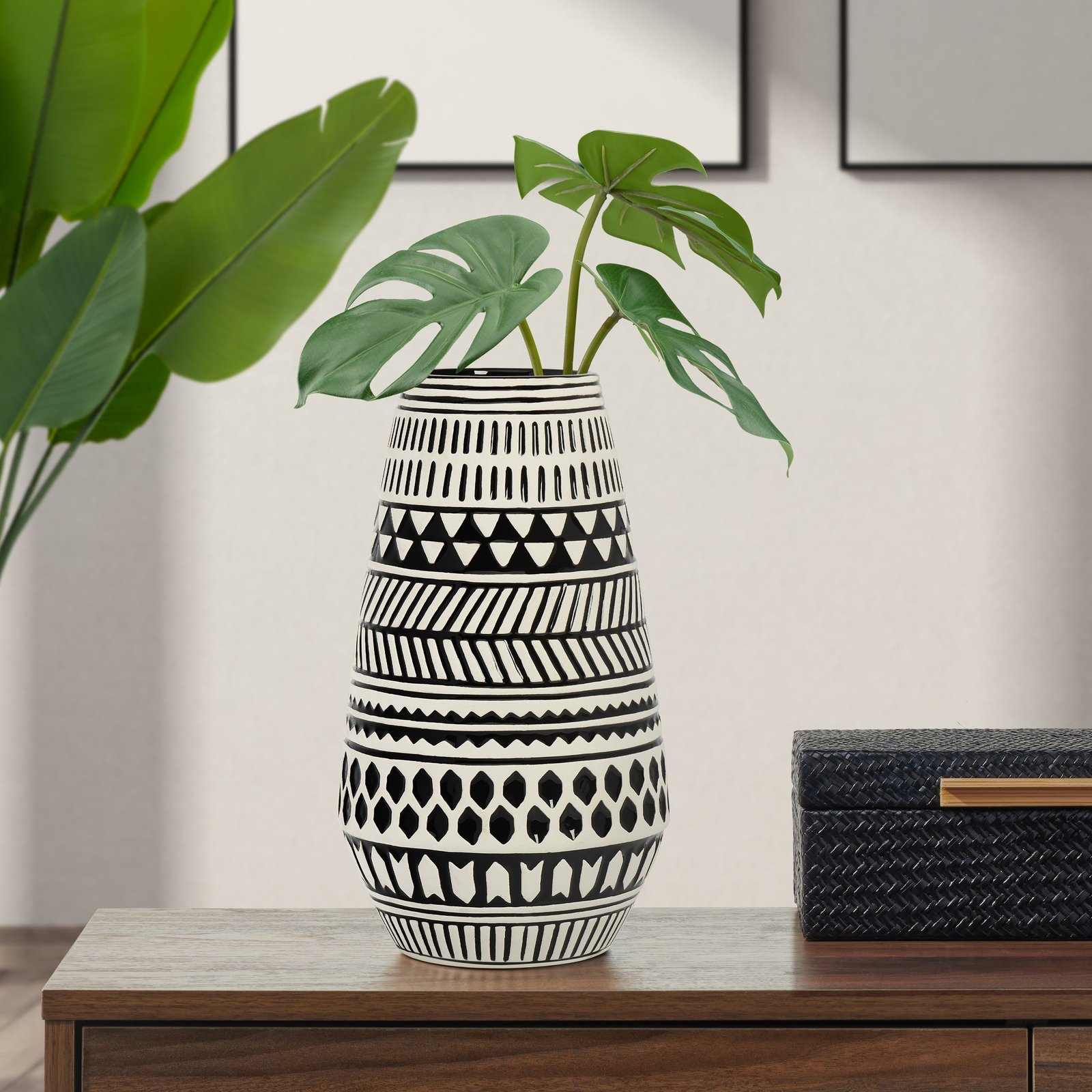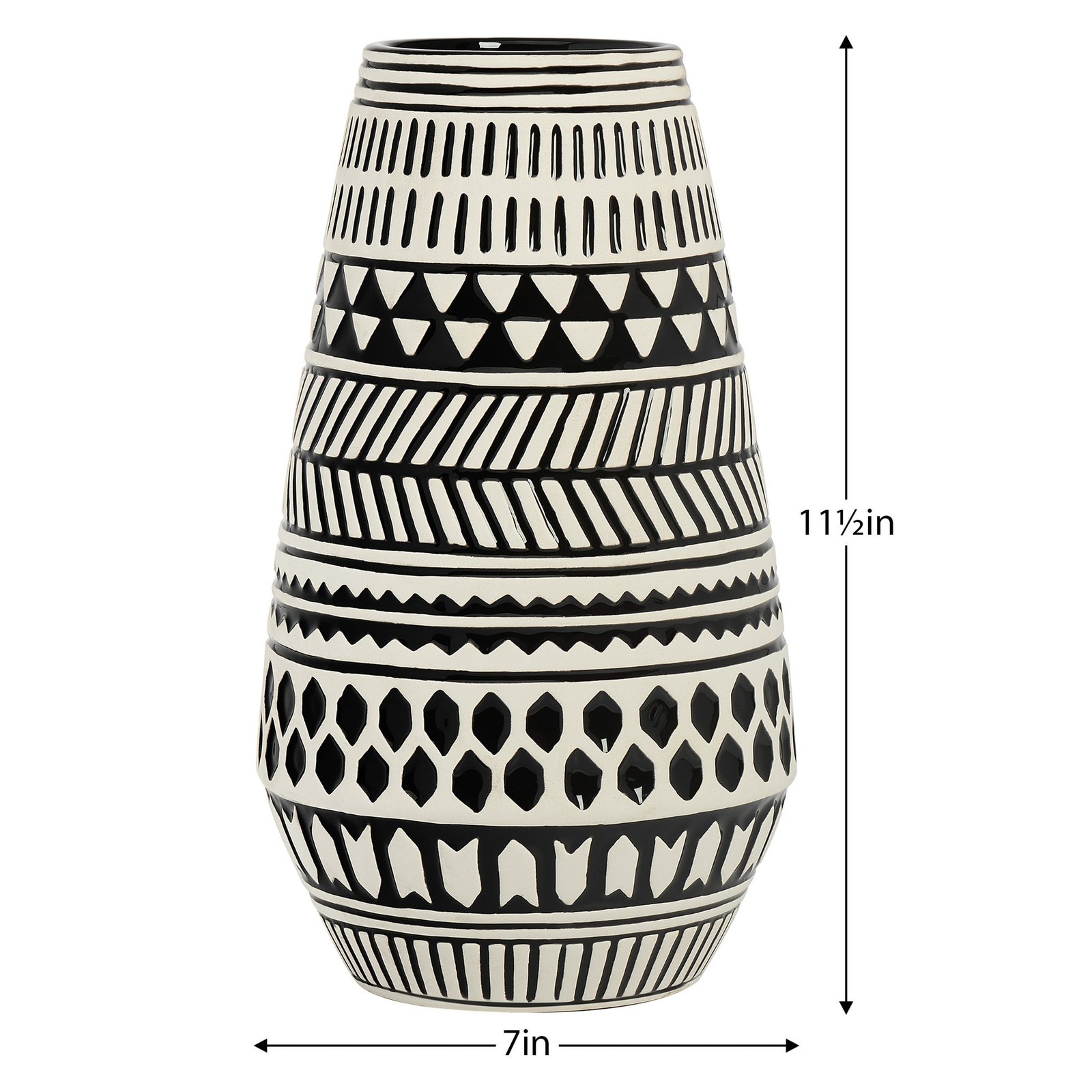 Make a stylish statement in your space with this black and white patterned ceramic vase featuring a captivating geometric design. This versatile piece is perfect for displaying your favorite floral bouquets adding a pop of visual interest to any space. Whether placed on a shelf or tabletop its eye-catching pattern and sleek color scheme effortlessly blend modern aesthetics with timeless elegance. Dimensions: 7d x 11.5h
