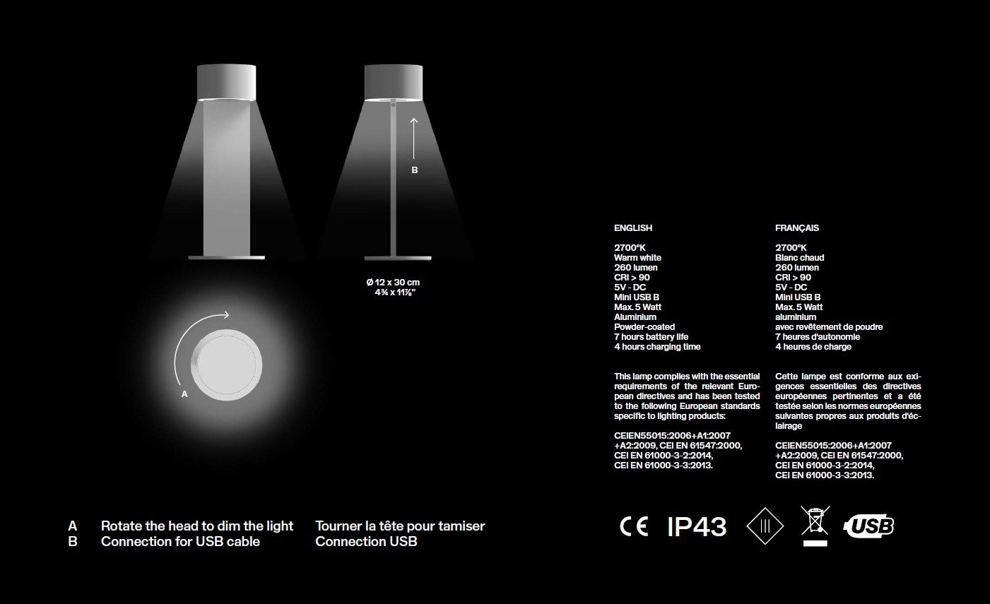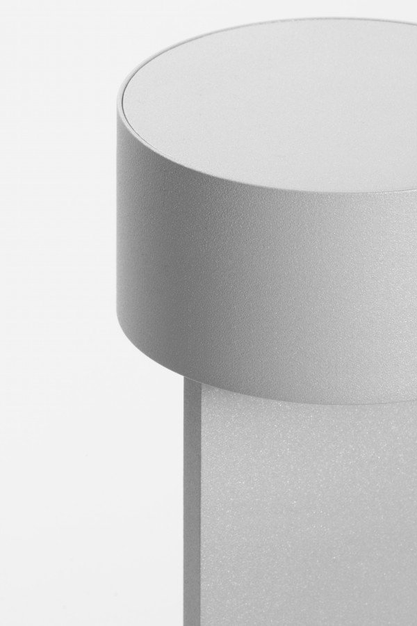 Times is a small portablelamp which once charged via USB cable emanates lightfor up to seven hours. A central potentiometer allows you to dim the light by rotating the head thus making the lamp versatile for a number of diverse situations. It can be a functional desk light or become suffused candle light. . Dimensions: 43/4”W x 43/4”D x 117/8”H