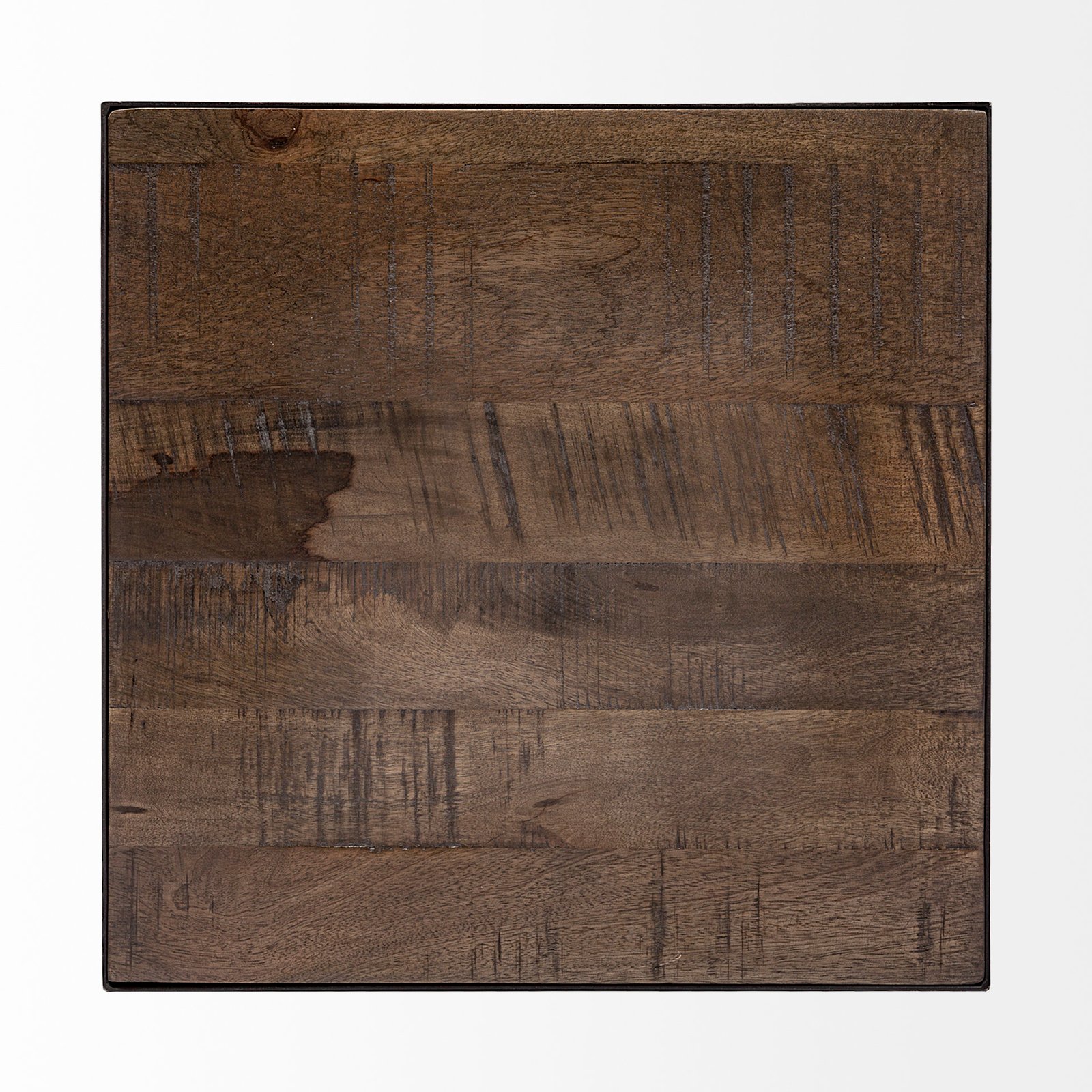 Featuring a four-legged base with cross bracing that is meticulously crafted from iron and finished in a premium matte-black polish the Trestman II is a stunning?side table that sports a spectacular mango wood?top finished in a natural medium brown tone which highlights the grain and variation of the wood. The popular but exquisite combination of dark metal tones and solid wood makes the Trestman II an instant hit in any space especially ones based on the Industrial Woodlands and?Mercana Modern?design styles.. Dimensions: 24.0L x 24.0W x 22.5H