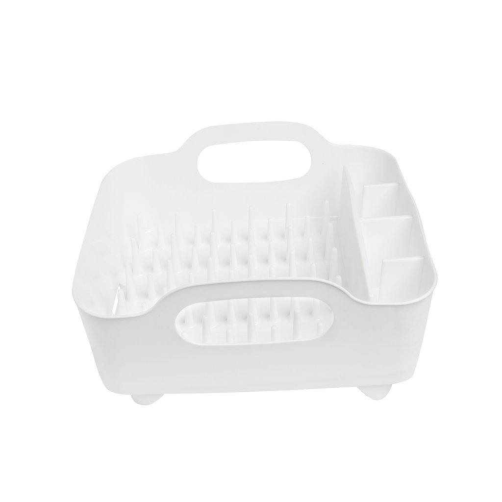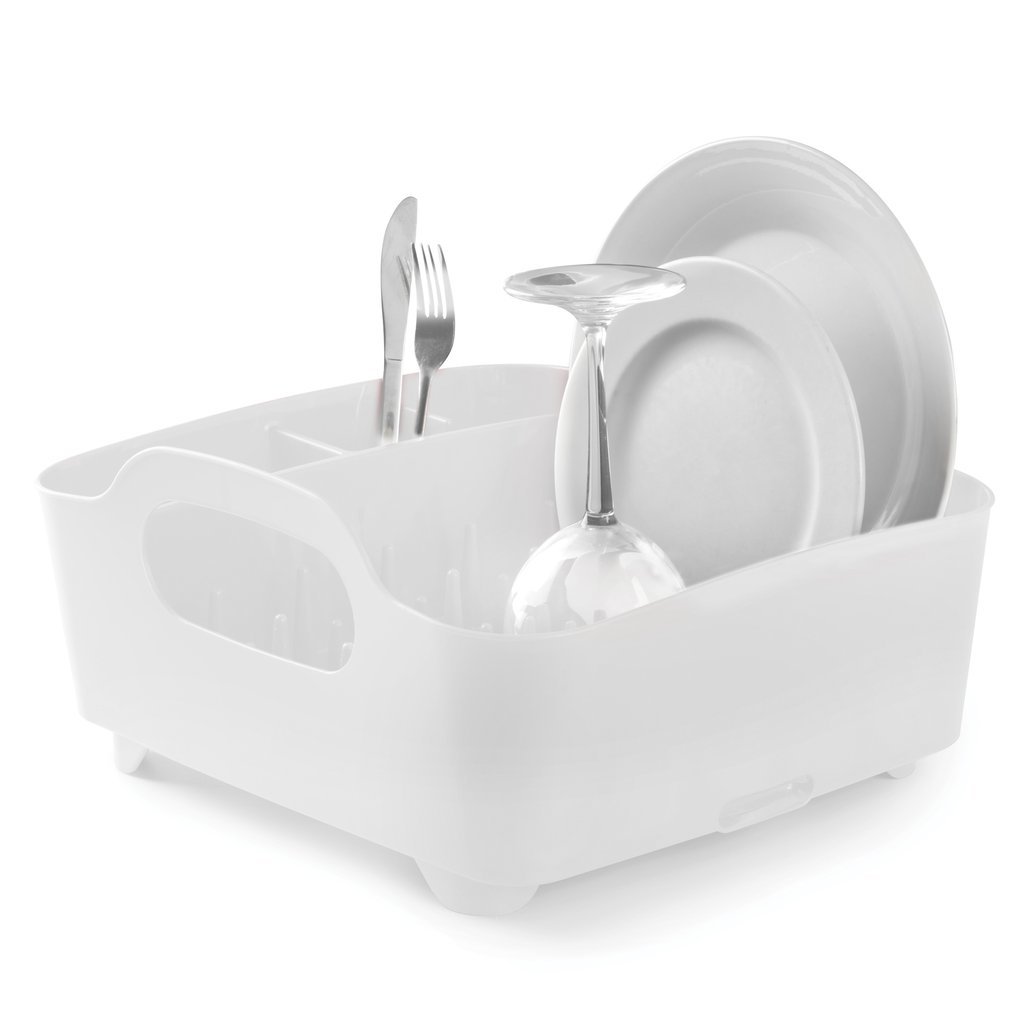 Umbra Tub Counter Top Dish RackTub Dish Rack pops with its versatility and straight-forwardness. With easy-grip handles self-draining spout and built-in utensil holder it holds various dish sizes and can sit in or out of the sink. Tub is an easy to use easy to clean all-in-one dish drying kitchen solution that you?re going to love it measures 15 x 14 x 7.5 inches and is available in a wide range of colors to match your existing d?cor or add a splash of color to your kitchen. Tub is easily transferred while fully-loaded from sink to counter and back again and can also double as a roomy dish-and-utensil caddy for parties and outdoor entertaining. U.S. Patent No. D677443 Dimensions: 14.28″ (36cm)L x 13.28″ (34cm)W x 7.2″ (18cm)H