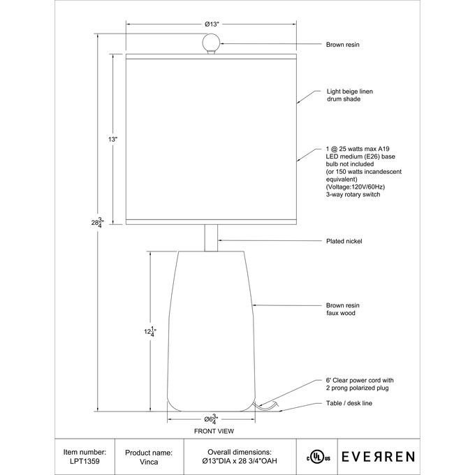Table LampResinPainted Brown FinishOff-White Linen Shade3-Way SwitchMax. 150WE26 SocketBulb Not IncludedColor May VaryNet Weight: 5.5lbs.Gross Weight: 8lbs.. Dimensions: