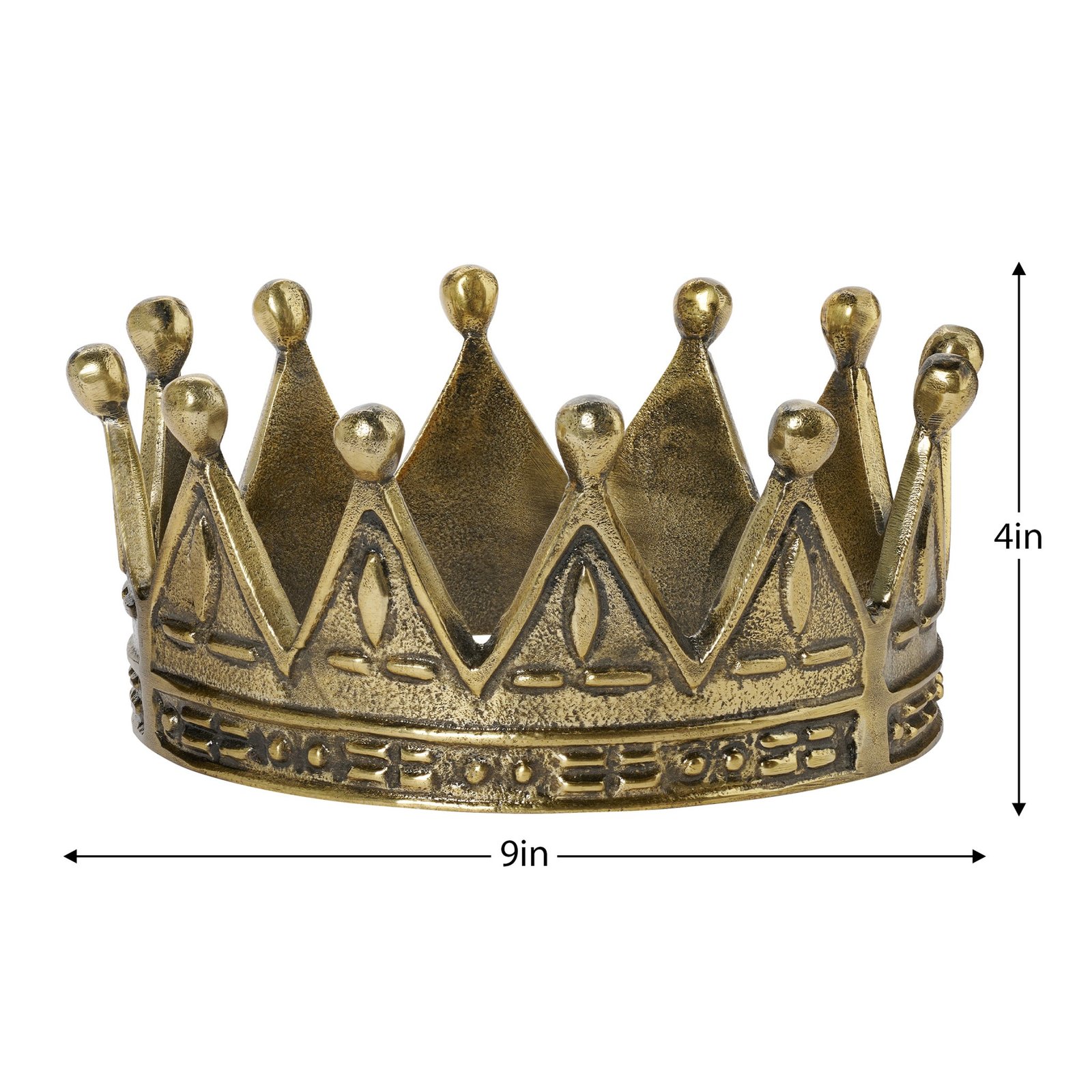 Finished in antique gold this crown-shaped decorative accent makes a bold sculptural statement. Its solid form and classic silhouette bring a sense of richness and character to any display. A striking piece for shelves consoles or tabletops. Dimensions: 9 inch diameter x 4 inch height